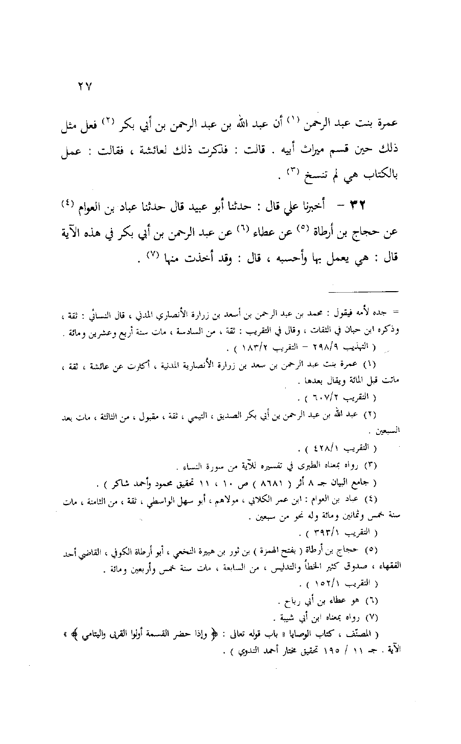 32 - حَدَّثَنَا أَبُو عُبَيْدٍ قَالَ: حَدَّثَنَا عَبَّادُ بْنُ الْعَوَّامِ، عَنْ حَجَّاجِ بْنِ أَرْطَأَةَ، عَنْ عَطَاءٍ، عَنْ، عَبْدِ الرَّحْمَنِ بْنِ أَبِي بَكْرٍ فِي هَذِهِ الْآيَةِ قَالَ: " §هِيَ يُعْمَلُ بِهَا، وَأَحْسَبُهُ قَالَ: وَقَدْ أَخَذْتُ مِنْهَا "