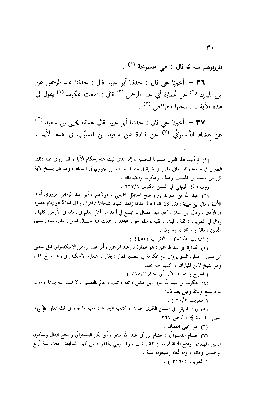 36 - حَدَّثَنَا أَبُو عُبَيْدٍ قَالَ: حَدَّثَنَا عَبْدُ الرَّحْمَنِ، عَنِ ابْنِ الْمُبَارَكِ، عَنْ عُمَارَةَ أَبِي عَبْدِ الرَّحْمَنِ قَالَ: سَمِعْتُ عِكْرِمَةَ يَقُولُ فِي هَذِهِ الْآيَةِ: «§نَسَخَتْهَا الْفَرَائِضُ»