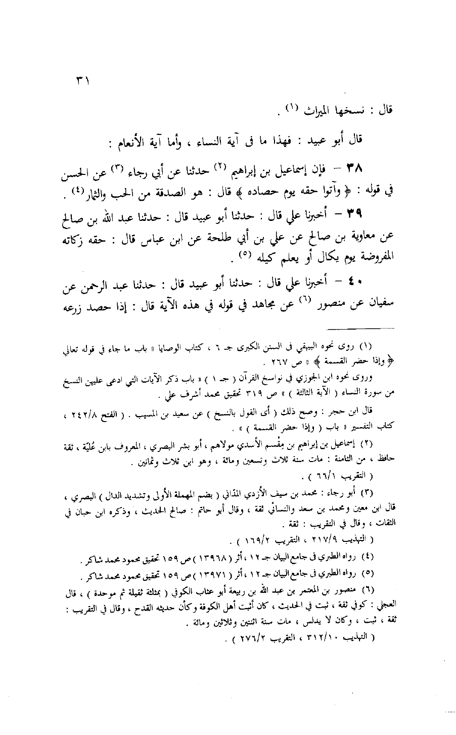 40 - حَدَّثَنَا أَبُو عُبَيْدٍ قَالَ: حَدَّثَنَا عَبْدُ الرَّحْمَنِ، عَنْ سُفْيَانَ، عَنْ مَنْصُورٍ، عَنْ مُجَاهِدٍ فِي قَوْلِهِ فِي هَذِهِ الْآيَةِ قَالَ: «§إِذَا حَصَدَ زَرْعَهُ -[32]- أَلْقَى لَهُمْ مِنَ السُّنْبُلِ، وَإِذَا جَدَّ نَخْلَهُ أَلْقَى لَهُمْ مِنَ الشَّمَارِيخِ، فَإِذَا كَالَهُ زَكَّاهُ» قَالَ أَبُو عُبَيْدٍ: فَهَذَا تَأْوِيلُ الَّذِينَ رَأَوَا الْآيَةَ مُحْكَمَةً إِلَّا أَنَّ ابْنَ عَبَّاسٍ وَالْحَسَنَ رَأَيَاهَا الزَّكَاةَ نَفْسَهَا فِي الْأَرْضِ، وَرَآهَا مُجَاهِدٌ مِنْ غَيْرِ الزَّكَاةِ، إِلَّا أَنَّهَا وَاجِبَةٌ عِنْدَهُ أَيْضًا، وَفِيهَا قَوْلٌ ثَالِثٌ