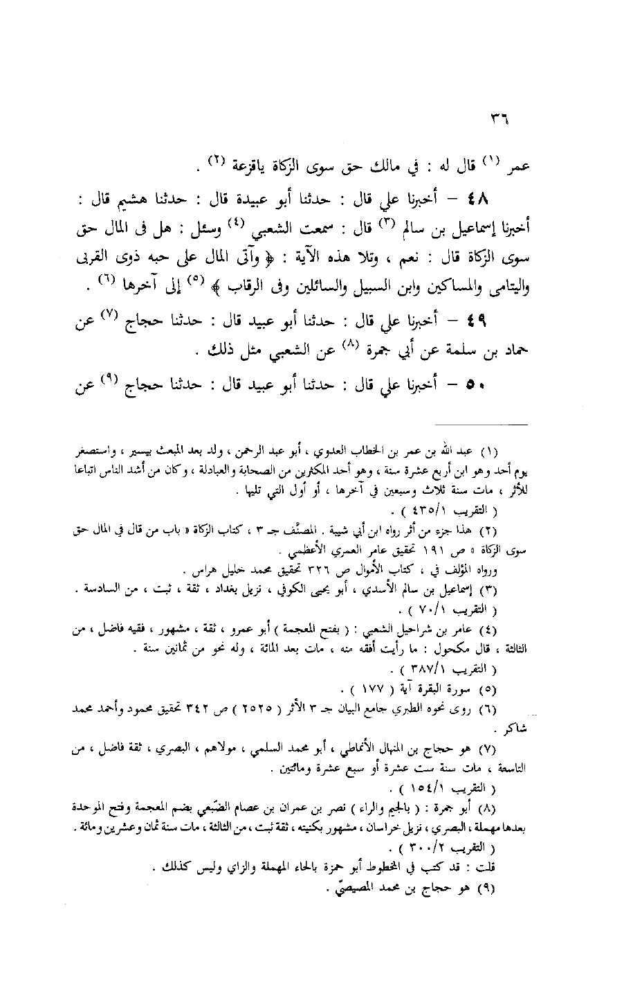 48 - حَدَّثَنَا أَبُو عُبَيْدٍ قَالَ: حَدَّثَنَا هُشَيْمٌ قَالَ: أَخْبَرَنَا إِسْمَاعِيلُ بْنُ سَالِمٍ قَالَ: سَمِعْتُ الشَّعْبِيَّ وَسُئِلَ: §هَلْ فِي الْمَالِ حَقٌّ سِوَى الزَّكَاةِ قَالَ: " نَعَمْ، وَتَلَا هَذِهِ الْآيَةَ: {وَآتَى الْمَالَ عَلَى حُبِّهِ ذَوِي الْقُرْبَى وَالْيَتَامَى وَالْمَسَاكِينَ وَابْنَ السَّبِيلِ وَالسَّائِلِينَ وَفِي الرِّقَابِ} [البقرة: 177] إِلَى آخِرِهَا " أَخْبَرَنَا عَلِيٌّ، قَالَ: حَدَّثَنَا أَبُو عُبَيْدٍ قَالَ: حَدَّثَنَا حَجَّاجٌ، عَنْ حَمَّادِ بْنِ سَلَمَةَ، عَنْ أَبِي جَمْرَةَ، عَنِ الشَّعْبِيِّ مِثْلَ ذَلِكَ