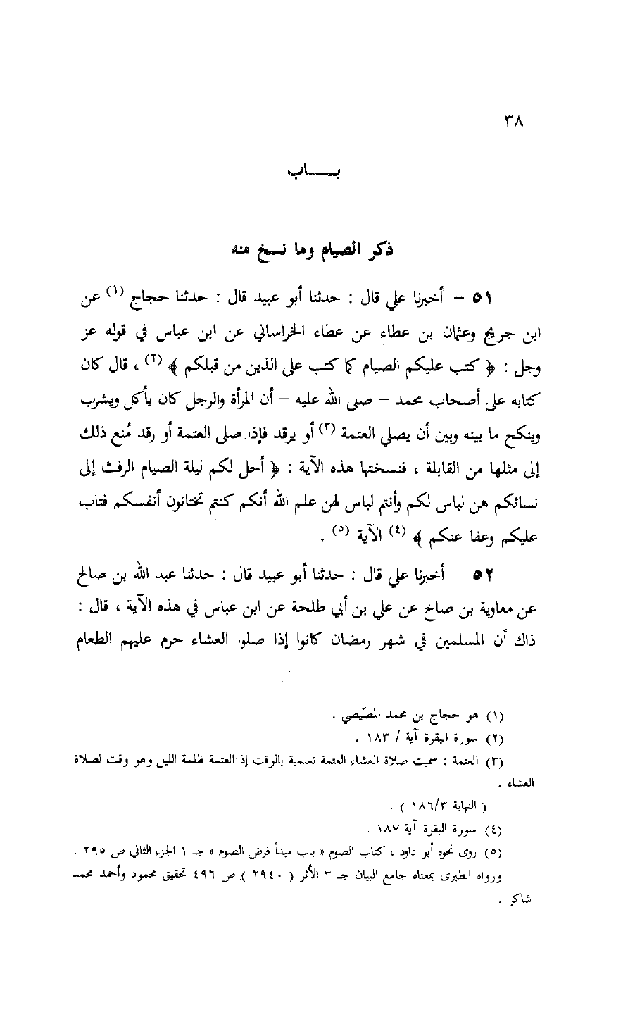51 - حَدَّثَنَا أَبُو عُبَيْدٍ قَالَ: حَدَّثَنَا حَجَّاجٌ، عَنِ ابْنِ جُرَيْجٍ , وَعُثْمَانَ بْنِ عَطَاءٍ، عَنْ عَطَاءٍ الْخُرَاسَانِيِّ، عَنِ ابْنِ عَبَّاسٍ فِي قَوْلِهِ عَزَّ وَجَلَّ: {كُتِبَ عَلَيْكُمُ الصِّيَامُ كَمَا كُتِبَ عَلَى الَّذِينَ مِنْ قَبْلِكُمْ} [البقرة: 183] قَالَ: " كَانَ كِتَابُهُ عَلَى أَصْحَابِ مُحَمَّدٍ صَلَّى اللَّهُ عَلَيْهِ أَنَّ §الْمَرْأَةَ وَالرَّجُلَ كَانَ يَأْكُلُ وَيَشْرَبُ وَيَنْكِحُ مَا بَيْنَهُ وَبَيْنَ أَنْ يُصَلِّيَ الْعَتَمَةَ، أَوْ يَرْقُدُ فَإِذَا صَلَّى الْعَتَمَةَ، أَوْ رَقَدَ مَنَعَ ذَلِكَ إِلَى مِثْلِهَا مِنَ الْقَابِلَةِ، فَنَسَخَتْهَا هَذِهِ الْآيَةُ: {أُحِلَّ لَكُمْ لَيْلَةَ الصِّيَامِ الرَّفَثُ إِلَى نِسَائِكُمْ، هُنَّ لِبَاسٌ لَكُمْ، وَأَنْتُمْ لِبَاسٌ لَهُنَّ، عَلِمَ اللَّهُ أَنَّكُمْ كُنْتُمْ تَخْتَانُونَ أَنْفُسَكُمْ، فَتَابَ عَلَيْكُمْ وَعَفَا عَنْكُمْ} [البقرة: 187] الْآيَةَ.