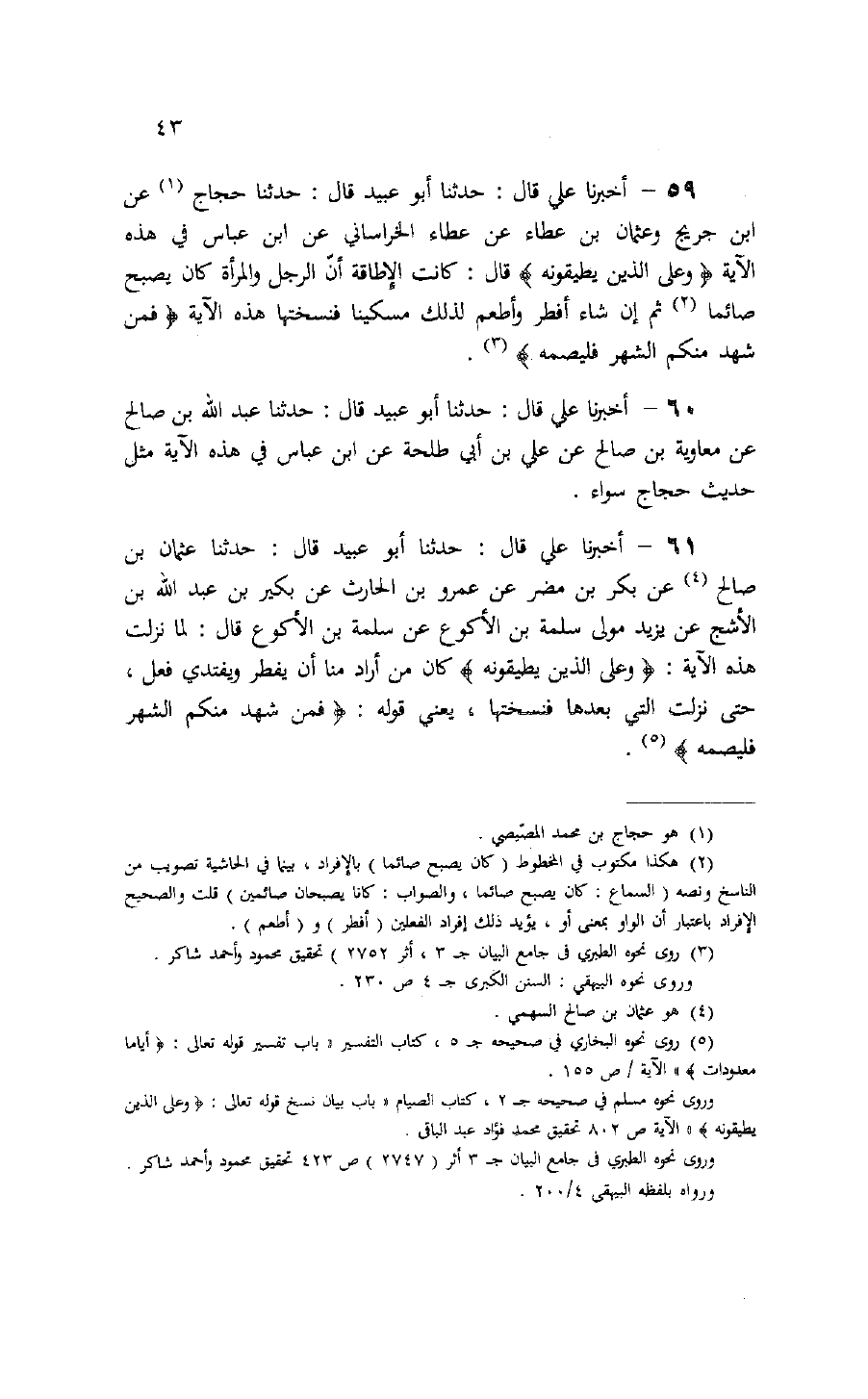 59 - حَدَّثَنَا أَبُو عُبَيْدٍ قَالَ: حَدَّثَنَا حَجَّاجٌ، عَنِ ابْنِ جُرَيْجٍ , وَعُثْمَانَ بْنِ عَطَاءٍ، عَنْ عَطَاءٍ الْخُرَاسَانِيِّ، عَنِ ابْنِ عَبَّاسٍ فِي هَذِهِ الْآيَةِ {وَعَلَى الَّذِينَ يُطِيقُونَهُ} [البقرة: 184] قَالَ: " كَانَتِ الْإِطَاقَةُ أَنَّ §الرَّجُلَ وَالْمَرْأَةَ كَانَ يُصْبِحُ صَائِمًا ثُمَّ إِنْ شَاءَ أَفْطَرَ وَأَطْعَمَ لِذَلِكَ مِسْكِينًا، فَنَسَخَتْهَا هَذِهِ الْآيَةُ: {فَمَنْ شَهِدَ مِنْكُمُ الشَّهْرَ فَلْيَصُمْهُ} [البقرة: 185] " أَخْبَرَنَا عَلِيٌّ قَالَ: حَدَّثَنَا أَبُو عُبَيْدٍ قَالَ: حَدَّثَنَا عَبْدُ اللَّهِ بْنُ صَالِحٍ، عَنْ مُعَاوِيَةَ بْنِ صَالِحٍ، عَنْ عَلِيِّ بْنِ أَبِي طَلْحَةَ، عَنِ ابْنِ عَبَّاسٍ فِي هَذِهِ الْآيَةِ مِثْلَ حَدِيثِ حَجَّاجٍ سَوَاءً