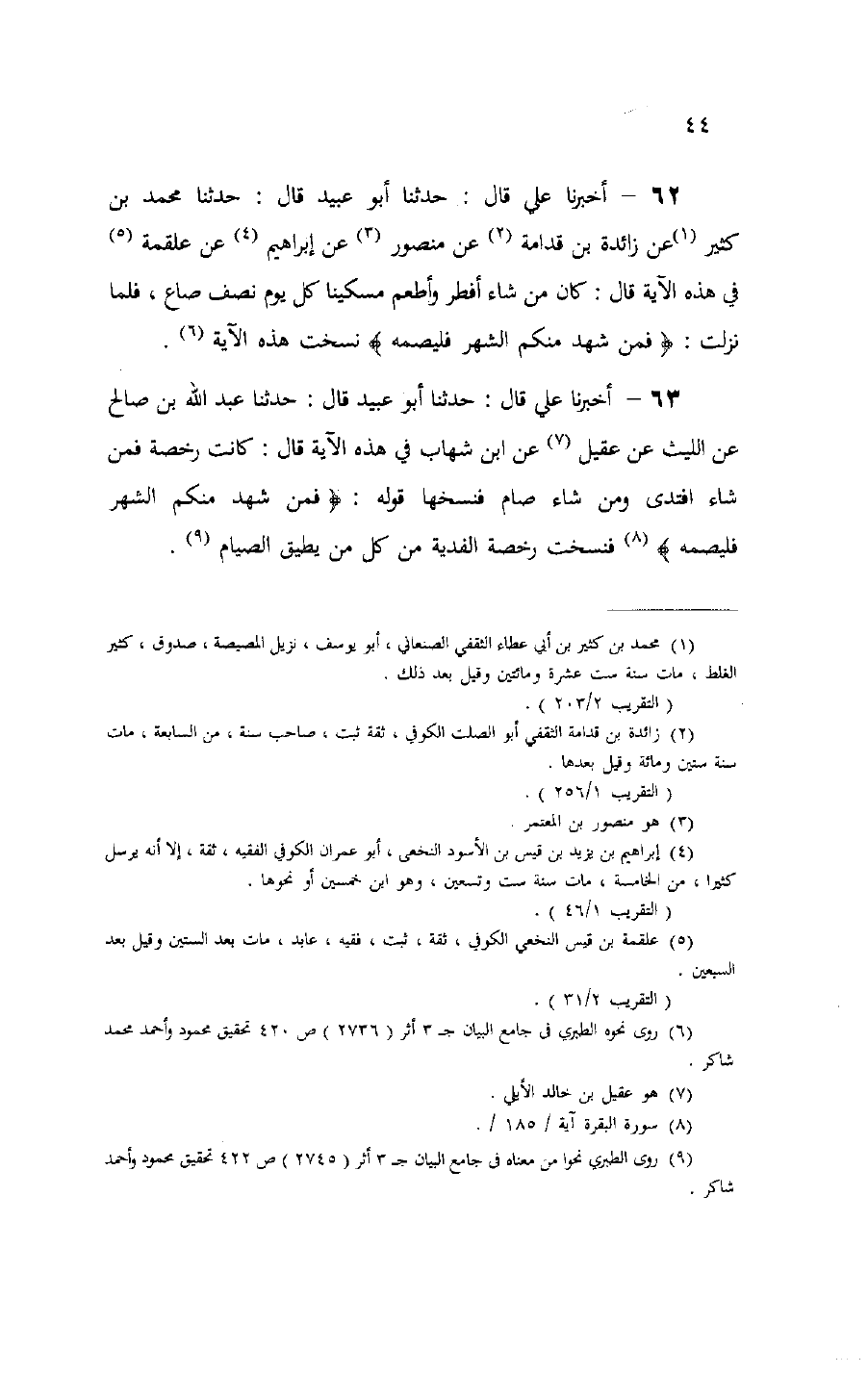 62 - حَدَّثَنَا أَبُو عُبَيْدٍ قَالَ: حَدَّثَنَا مُحَمَّدُ بْنُ كَثِيرٍ، عَنْ زَائِدَةَ بْنِ قُدَامَةَ، عَنْ مَنْصُورٍ، عَنْ إِبْرَاهِيمَ، عَنْ عَلْقَمَةَ فِي هَذِهِ الْآيَةِ قَالَ: " كَانَ §مَنْ شَاءَ أَفْطَرَ وَأَطْعَمَ مِسْكِينًا كُلَّ يَوْمٍ نِصْفَ صَاعٍ، فَلَمَّا نَزَلَتْ: {فَمَنْ شَهِدَ مِنْكُمُ الشَّهْرَ فَلْيَصُمْهُ} [البقرة: 185] نُسِخَتْ هَذِهِ الْآيَةُ "