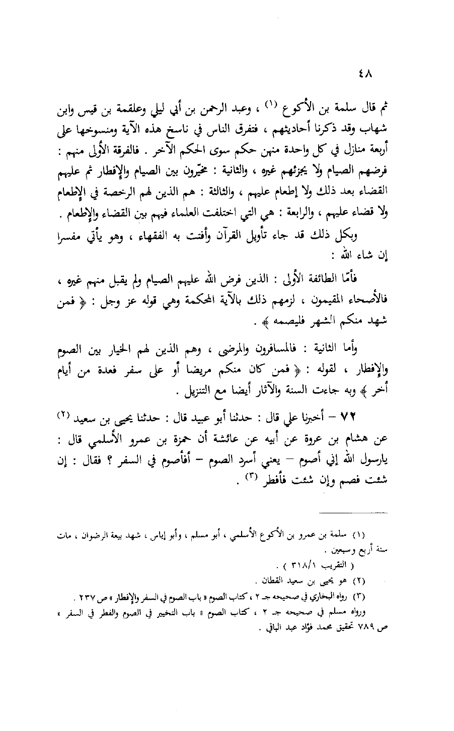 72 - حَدَّثَنَا أَبُو عُبَيْدٍ قَالَ: حَدَّثَنَا يَحْيَى بْنُ سَعِيدٍ، عَنْ هِشَامِ بْنِ عُرْوَةَ، عَنْ أَبِيهِ، عَنْ عَائِشَةَ، أَنَّ حَمْزَةَ بْنَ عَمْرٍو الْأَسْلَمِيَّ قَالَ: يَا رَسُولَ اللَّهِ إِنِّي أَصُومُ يَعْنِي: أَسْرُدُ الصَّوْمَ، §أَفَأَصُومُ فِي السَّفَرِ؟ فَقَالَ: «إِنْ شِئْتَ فَصُمْ، وَإِنْ شِئْتَ فَأَفْطِرْ» -[49]- أخبرنا علي قال: حَدَّثَنَا أَبُو عُبَيْدٍ قَالَ: حَدَّثَنَا سَعِيدُ بْنُ عَبْدِ الرَّحْمَنِ الْجُمَحِيُّ، عَنْ هِشَامِ بْنِ عُرْوَةَ، عَنْ أَبِيهِ، عَنْ حَمْزَةَ بْنِ عَمْرٍو الْأَسْلَمِيِّ عَنِ النَّبِيِّ صَلَّى اللهُ عَلَيْهِ وَسَلَّمَ مِثْلَ ذَلِكَ وَلَمْ يَذْكُرْ عَائِشَةَ أَخْبَرَنَا عَلِيٌّ قَالَ: حَدَّثَنَا أَبُو عُبَيْدٍ قَالَ: حَدَّثَنَا أَحْمَدُ بْنُ خَالِدٍ الْوَهْبِيُّ، مِنْ أَهْلِ حِمْصٍ، عَنْ مُحَمَّدِ بْنِ إِسْحَاقَ، عَنْ عِمْرَانَ بْنِ أَبِي أَنَسٍ قَالَ: حَدَّثَنِي سُلَيْمَانُ بْنُ يَسَارٍ , وَحَنْظَلَةُ بْنُ عَلِيٍّ، جَمِيعًا، عَنْ حَمْزَةَ بْنِ عَمْرٍو الْأَسْلَمِيِّ عَنِ النَّبِيِّ صَلَّى اللهُ عَلَيْهِ وَسَلَّمَ مِثْلَ ذَلِكَ. أخبرنا علي قال: حَدَّثَنَا أبو عبيد قال: حَدَّثَنَا عَبْدُ الْوَهَّابِ بْنُ عَطَاءٍ، عَنْ هِشَامٍ الدَّسْتُوَائِيِّ، عَنْ قَتَادَةَ، عَنْ سُلَيْمَانَ بْنِ يَسَارٍ، عَنْ حَمْزَةَ بْنِ عَمْرٍو عَنِ النَّبِيِّ صَلَّى اللَّهُ عَلَيْهِ مِثْلَ ذَلِكَ