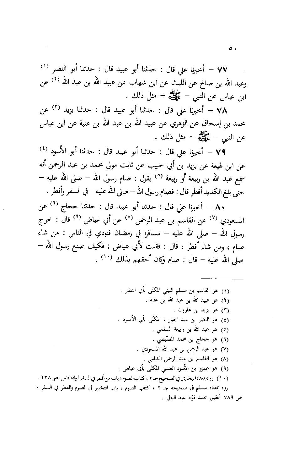 80 - حَدَّثَنَا أَبُو عُبَيْدٍ قَالَ: حَدَّثَنَا حَجَّاجٌ، عَنِ الْمَسْعُودِيِّ، عَنِ الْقَاسِمِ بْنِ عَبْدِ الرَّحْمَنِ، عَنْ أَبِي عِيَاضٍ قَالَ: خَرَجَ رَسُولُ اللَّهِ صَلَّى اللَّهُ عَلَيْهِ مُسَافِرًا فِي رَمَضَانَ، §فَنُودِيَ فِي النَّاسِ: مَنْ شَاءَ صَامَ، وَمَنْ شَاءَ أَفْطَرَ قَالَ: فَقُلْتُ لِأَبِي عِيَاضٍ: فَكَيْفَ صَنَعَ رَسُولُ اللَّهِ صَلَّى اللَّهُ عَلَيْهِ؟ قَالَ: «صَامَ وَكَانَ أَحَقَّهُمْ بِذَلِكَ»