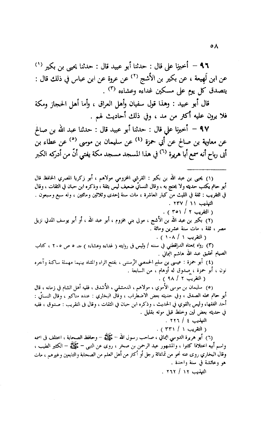 96 - حَدَّثَنَا أَبُو عُبَيْدٍ قَالَ: حَدَّثَنَا يَحْيَى بْنُ بُكَيْرٍ، عَنِ ابْنِ لَهِيعَةَ، عَنْ بُكَيْرِ بْنِ الْأَشَجِّ، عَنْ عُرْوَةَ، عَنِ ابْنِ عَبَّاسٍ، فِي ذَلِكَ قَالَ: «§يَتَصَدَّقُ كُلَّ يَوْمٍ عَلَى مِسْكِينٍ، غَدَاءَهُ، وَعَشَاءَهُ» قَالَ أَبُو عُبَيْدٍ: وَهَذَا قَوْلُ سُفْيَانَ وَأَهْلِ الْعِرَاقِ، وَأَمَّا أَهْلُ الْحِجَازِ وَمَكَّةَ، فَلَا يَرَوْنَ عَلَيْهِ أَكْثَرَ مِنْ مُدٍّ، وَفِي ذَلِكَ أَحَادِيثُ لَهُمْ