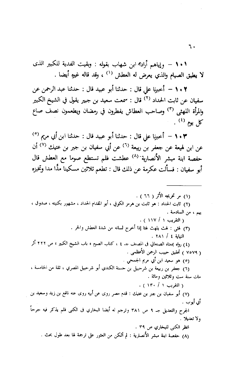 102 - حَدَّثَنَا أَبُو عُبَيْدٍ قَالَ: حَدَّثَنَا عَبْدُ الرَّحْمَنِ، عَنْ سُفْيَانَ، عَنْ ثَابِتٍ الْحَدَّادِ قَالَ: سَمِعْتُ سَعِيدَ بْنَ جُبَيْرٍ يَقُولُ فِي §الشَّيْخِ الْكَبِيرِ وَالْمَرْأَةِ اللَّهْثَى وَصَاحِبِ الْعِطَاشِ: «يُفْطِرُونَ فِي رَمَضَانَ، وَيُطْعِمُونَ نِصْفَ صَاعٍ كُلَّ يَوْمٍ»