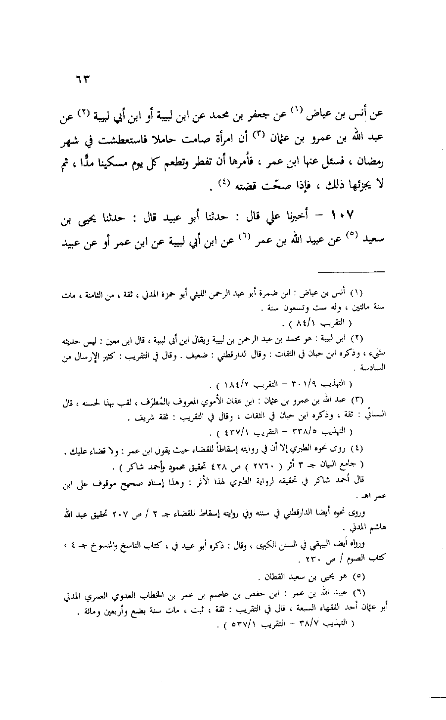 107 - حَدَّثَنَا أَبُو عُبَيْدٍ قَالَ: حَدَّثَنَا يَحْيَى بْنُ سَعِيدٍ، عَنْ عُبَيْدِ اللَّهِ بْنِ عُمَرَ، عَنِ ابْنِ أَبِي لَبِيبَةَ، عَنِ ابْنِ عُمَرَ أَوْ عَنْ -[64]- عُبَيْدِ اللَّهِ، عَنْ نَافِعٍ، عَنِ ابْنِ أَبِي لَبِيبَةَ، عَنِ ابْنِ عُمَرَ، فِي ذَلِكَ أَنَّهُ قَالَ: «§تُفْطِرُ وَتُطْعِمُ كُلَّ يَوْمٍ مِسْكِينًا» غَيْرَ أَنَّ يَحْيَى لَمْ يَذْكُرِ الْقَضَاءَ فِي حَدِيثِهِ، شَكَّ أَبُو عُبَيْدٍ فِي نَافِعٍ، وَلَمْ يَشُكَّ فِي ابْنِ أَبِي لَبِيبَةَ