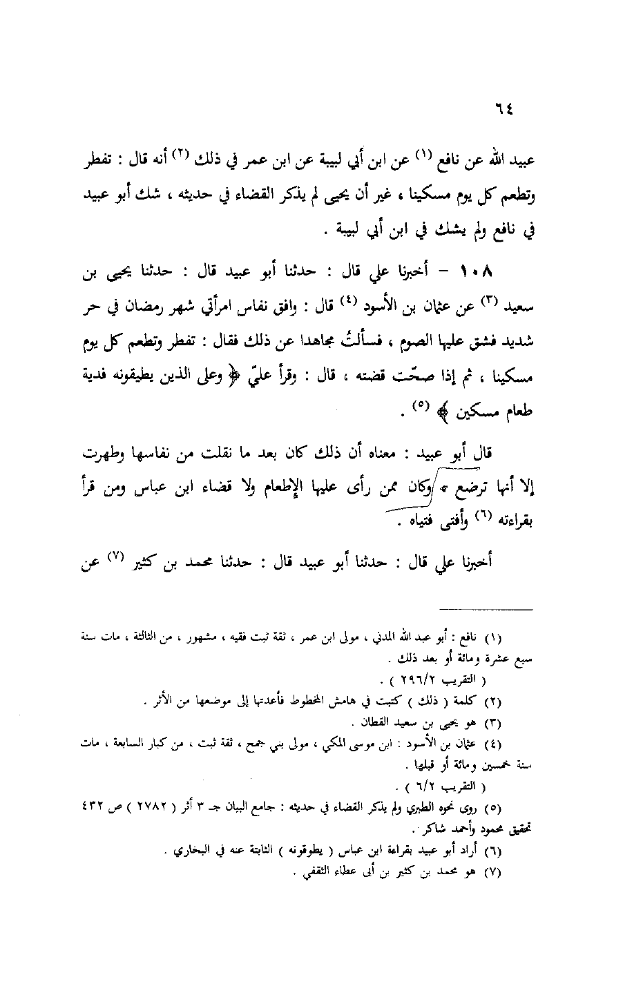 108 - حَدَّثَنَا أَبُو عُبَيْدٍ قَالَ: حَدَّثَنَا يَحْيَى بْنُ سَعِيدٍ، عَنْ عُثْمَانَ بْنِ الْأَسْوَدِ قَالَ: وَافَقَ نِفَاسُ امْرَأَتِي شَهْرَ رَمَضَانَ فِي حَرٍّ شَدِيدٍ، فَشَقَّ عَلَيْهَا الصَّوْمُ، فَسَأَلَتْ مُجَاهِدًا عَنْ ذَلِكَ، فَقَالَ: " §تُفْطِرُ وَتُطْعِمُ كُلَّ يَوْمٍ مِسْكِينًا، ثُمَّ إِذَا صَحَّتْ قَضَتْهُ قَالَ: وَقَرَأَ عَلَيَّ: {وَعَلَى الَّذِينَ يُطِيقُونَهُ فِدْيَةٌ طَعَامُ مِسْكِينٍ} [البقرة: 184] " قَالَ أَبُو عُبَيْدٍ: مَعْنَاهُ أَنَّ ذَلِكَ كَانَ بَعْدَمَا نُقِلَتْ مِنْ نِفَاسِهَا وَطَهُرَتْ إِلَّا أَنَّهَا تُرْضِعُ، وَكَانَ مِمَّنْ رَأَى عَلَيْهَا الْإِطْعَامَ وَلَا قَضَاءَ ابْنُ عَبَّاسٍ، وَمَنْ قَرَأَ بِقِرَاءَتِهِ وَأَفْتَى فُتْيَاهُ