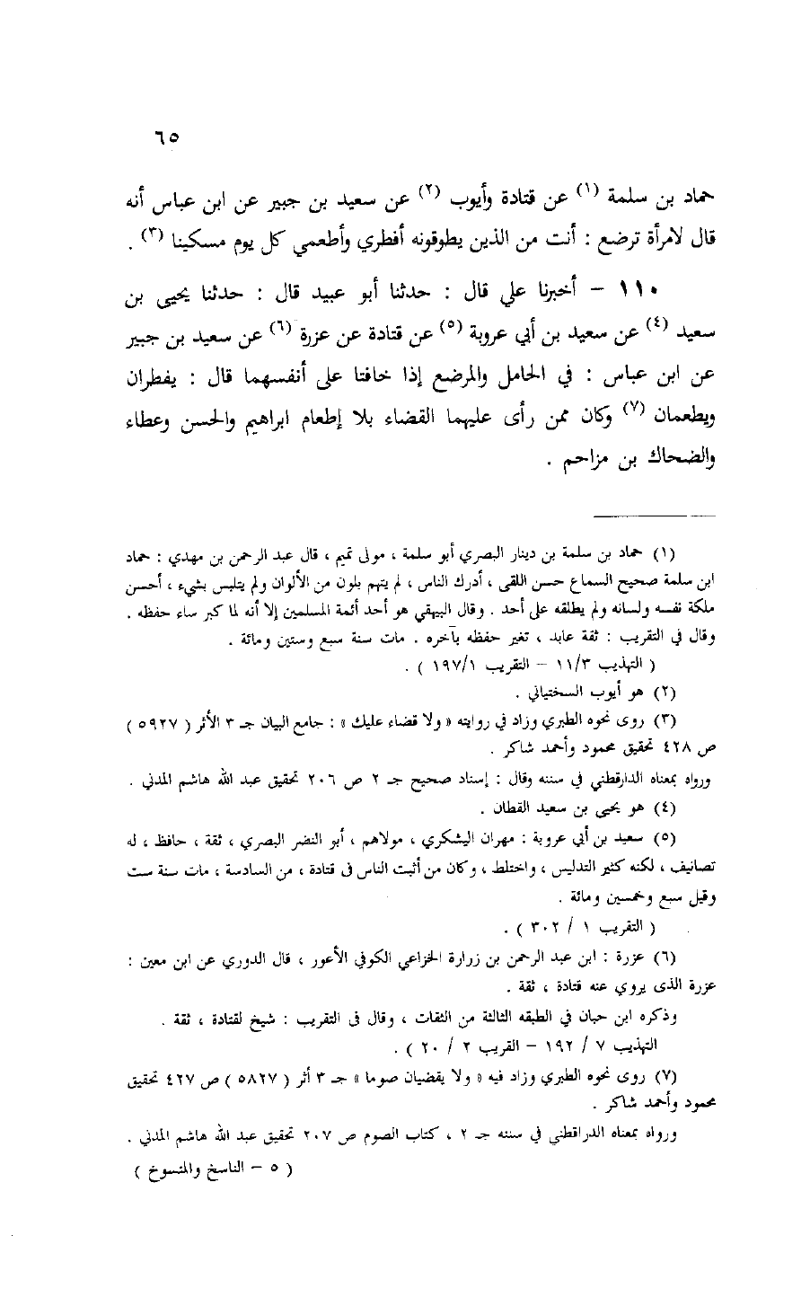 110 - حَدَّثَنَا أَبُو عُبَيْدٍ قَالَ: حَدَّثَنَا يَحْيَى بْنُ سَعِيدٍ، عَنْ سَعِيدِ بْنِ أَبِي عَرُوبَةَ، عَنْ قَتَادَةَ، عَنْ عَزْرَةَ، عَنْ سَعِيدِ بْنِ جُبَيْرٍ، عَنِ ابْنِ عَبَّاسٍ، فِي " §الْحَامِلِ وَالْمُرْضِعِ إِذَا خَافَتَا عَلَى أَنْفُسِهِمَا قَالَ: يُفْطِرَانِ وَيُطْعِمَانِ "، وَكَانَ مِمَّنْ رَأَى عَلَيْهِمَا الْقَضَاءَ بِلَا إِطْعَامٍ إِبْرَاهِيمُ، وَالْحَسَنُ، وَعَطَاءٌ، وَالضَّحَّاكُ بْنُ مُزَاحِمٍ