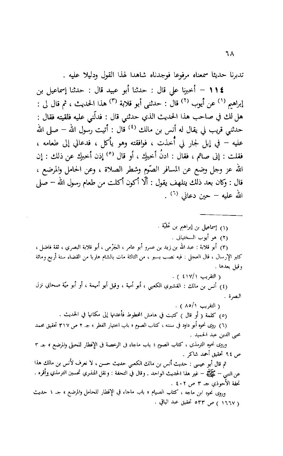 114 - حَدَّثَنَا أَبُو عُبَيْدٍ قَالَ: حَدَّثَنَا إِسْمَاعِيلُ بْنُ إِبْرَاهِيمَ، عَنْ أَيُّوبَ قَالَ: حَدَّثَنِي أَبُو قِلَابَةَ، هَذَا الْحَدِيثَ، ثُمَّ قَالَ لِي: هَلْ لَكَ فِي صَاحِبِ هَذَا الْحَدِيثِ الَّذِي حَدَّثَنِي؟ قَالَ: فَدُلَّنِي عَلَيْهِ، فَلَقِيتُهُ، فَقَالَ: حَدَّثَنِي قَرِيبٌ لِي يُقَالُ لَهُ أَنَسُ بْنُ مَالِكٍ قَالَ: أَتَيْتُ رَسُولَ اللَّهِ صَلَّى اللَّهُ عَلَيْهِ فِي إِبِلٍ لِجَارٍ لِي أُخِذَتْ، فَوَافَقْتُهُ وَهُوَ يَأْكُلُ، فَدَعَانِي إِلَى طَعَامِهِ، فَقُلْتُ: إِنِّي صَائِمٌ، فَقَالَ: " ادْنُ أُخْبِرْكَ، أَوْ قَالَ: إِذَنْ أُخْبِرُكَ عَنْ ذَلِكَ: «إِنَّ §اللَّهَ عَزَّ وَجَلَّ وَضَعَ عَنِ الْمُسَافِرِ الصَّوْمَ وَشَطْرَ الصَّلَاةِ، وَعَنِ الْحَامِلِ وَالْمُرْضِعِ» قَالَ: وَكَانَ بَعْدَ ذَلِكَ يَتَلَهَّفُ يَقُولُ: أَلَا أَكُونُ أَكَلْتُ مِنْ طَعَامِ رَسُولِ اللَّهِ صَلَّى اللَّهُ عَلَيْهِ حِينَ دَعَانِي " -[69]- قَالَ أَبُو عُبَيْدٍ: «وَلَمْ يُسْمَعْ لِلْحَامِلِ وَالْمُرْضِعِ فِي الصِّيَامِ بِذِكْرٍ عَنِ النَّبِيِّ صَلَّى اللَّهُ عَلَيْهِ إِلَّا فِي هَذَا الْحَدِيثِ، أَفَلَا تَرَى أَنَّ رَسُولَ اللَّهِ صَلَّى اللهُ عَلَيْهِ وَسَلَّمَ قَدْ قَرَنَهُمَا بِالْمُسَافِرِ وَجَعَلَهُمَا مَعًا فِي مَعْنًى وَاحِدٍ، فَصَارَ حُكْمَهُمَا كَحُكْمِهِ، فَهَلْ عَلَى الْمُسَافِرِ إِذَا أَفْطَرَ إِلَّا الْقَضَاءُ، لَا يُقْضَى عَنْهُ وَلَا يَعْدُوهُ إِلَى غَيْرِهِ» قَالَ أَبُو عُبَيْدٍ: «فَهَذَا شَرَائِعُ الصِّيَامِ نَاسِخُهَا وَمَنْسُوخُهَا وَمَوَاضِعُ الْقَضَاءِ مِنْ مَوَاضِعِ الْإِطْعَامِ فِي تَأْوِيلِ الْكِتَابِ وَالسُّنَّةِ، وَمِنْهُ اسْتَنْبَطْتِ الْعُلَمَاءُ إِيجَابَ الطَّعَامِ عَلَى كُلِّ مَنْ حِيلَ بَيْنَهُ وَبَيْنَ الصِّيَامِ حَتَّى أَفْتَوْا بِهِ فِي الْمَوْتَى إِذَا كَانَ ذَلِكَ قَدْ أُوجِبَ عَلَيْهِمْ، وَفِيمَنْ تَوَالَى عَلَيْهِ رَمَضَانَانِ، وَفِيهِ أَحَادِيثُ كَثِيرَةٌ لَيْسَ مَوْضِعُهَا هَاهُنَا» قَالَ أَبُو عُبَيْدٍ: «فَهَذَا مَا جَاءَ فِي نَاسِخِ صِيَامِ رَمَضَانَ وَمَنْسُوخِهِ مَعَ أَنَّهُ قَدْ كَانَ رَمَضَانُ يُرَى مِنْهُ نَاسِخًا لِمَا كَانَ قَبْلَهُ، وَهُوَ صِيَامُ عَاشُورَاءَ، بِذَلِكَ جَاءَ الْأَثَرُ»