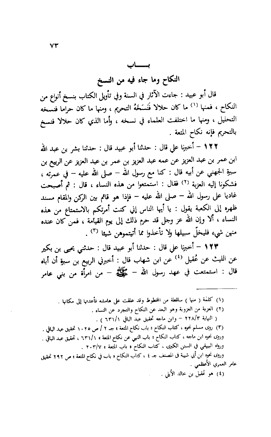 122 - حَدَّثَنَا أَبُو عُبَيْدٍ قَالَ: حَدَّثَنَا بِشْرُ بْنُ عَبْدِ اللَّهِ بْنِ عُمَرَ بْنِ عَبْدِ الْعَزِيزِ، عَنْ عَمِّهِ عَبْدِ الْعَزِيزِ بْنِ عُمَرَ بْنِ عَبْدِ الْعَزِيزِ، عَنِ الرَّبِيعِ بْنِ سَبْرَةَ الْجُهَنِيِّ، عَنْ أَبِيهِ قَالَ: كُنَّا مَعَ رَسُولِ اللَّهِ صَلَّى اللَّهُ عَلَيْهِ فِي عُمْرَتِهِ، فَشَكَوْنَا إِلَيْهِ الْعُزْبَةَ، فَقَالَ: «§اسْتَمْتِعُوا مِنْ هَذِهِ النِّسَاءِ» قَالَ: ثُمَّ أَصْبَحْتُ غَادِيًا عَلَى رَسُولِ اللَّهِ صَلَّى اللَّهُ عَلَيْهِ، فَإِذَا هُوَ قَائِمٌ بَيْنَ الرُّكْنِ وَالْمَقَامِ مُسْنِدٌ ظَهْرَهُ إِلَى الْكَعْبَةِ يَقُولُ: «يَا أَيُّهَا النَّاسُ إِنِّي كُنْتُ أَمَرْتُكُمْ بِالِاسْتِمْتَاعِ مِنْ هَذِهِ النِّسَاءِ، أَلَا وَإِنَّ اللَّهَ عَزَّ وَجَلَّ قَدْ حَرَّمَ ذَلِكَ إِلَى يَوْمِ الْقِيَامَةِ،» فَمَنْ كَانَ عِنْدَهُ مِنْهُنَّ شَيْءٌ، فَلْيُخَلِّ سَبِيلَهَا وَلَا تَأْخُذُوا مِمَّا آتَيْتُمُوهُنَّ شَيْئًا "