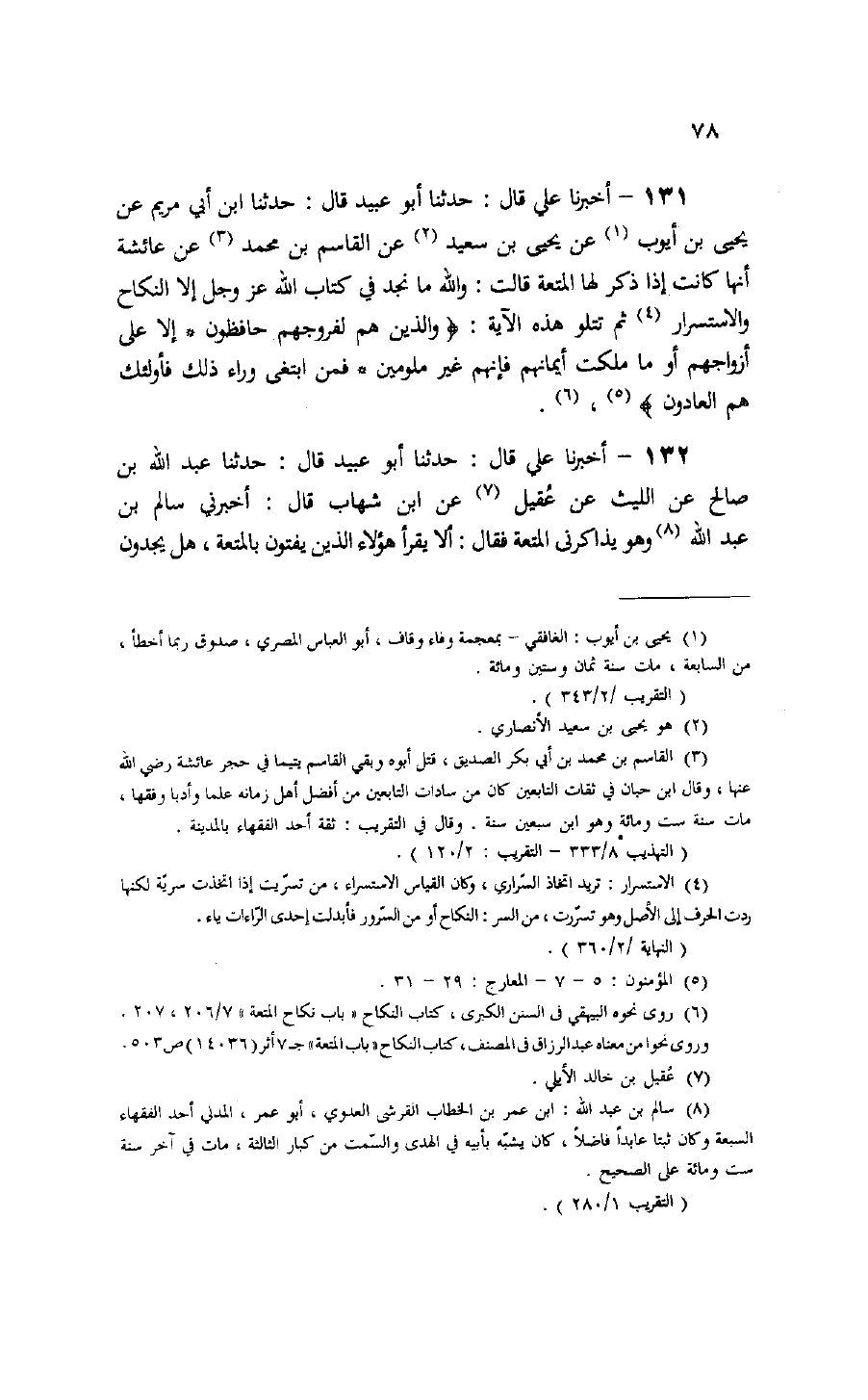 132 - حَدَّثَنَا أَبُو عُبَيْدٍ قَالَ: حَدَّثَنَا عَبْدُ اللَّهِ بْنُ صَالِحٍ، عَنِ اللَّيْثِ، عَنْ عُقَيْلٍ، عَنِ ابْنِ شِهَابٍ قَالَ: أَخْبَرَنِي سَالِمُ بْنُ عَبْدِ اللَّهِ، وَهُوَ يُذَاكِرُنِي الْمُتْعَةَ، فَقَالَ: أَلَا يَقْرَأُ هَؤُلَاءِ الَّذِينَ يُفْتُونَ بِالْمُتْعَةِ، «§هَلْ يَجِدُونَ -[79]- فِي كِتَابِ اللَّهِ عَزَّ وَجَلَّ مِنْ نِكَاحٍ إِلَّا لَهُ طَلَاقٌ وَإِلَّا لَهُ عِدَّةٌ وَإِلَّا لَهُ مِيرَاثٌ؟» قَالَ: وَقَالَ لِلْقَاسِمِ بْنِ مُحَمَّدٍ: وَهُوَ يُذَاكِرُنِي ذَلِكَ كَيْفَ يَجْتَرِئُونَ عَلَى الْفُتْيَا بِالْمُتْعَةِ وَقَدْ قَالَ اللَّهُ عَزَّ وَجَلَّ فِي كِتَابِهِ: {وَالَّذِينَ هُمْ لِفُرُوجِهِمْ حَافِظُونَ} [المؤمنون: 5] إِلَى قَوْلِهِ: {فَأُولَئِكَ هُمُ الْعَادُونَ} [المؤمنون: 7] أَخْبَرَنَا عَلِيٌّ قَالَ: حَدَّثَنَا أَبُو عُبَيْدٍ قَالَ: حَدَّثَنَا أَبُو الْأَسْوَدِ، عَنِ ابْنِ لَهِيعَةَ، عَنْ عُقَيْلٍ، عَنِ ابْنِ شِهَابٍ، عَنْ سَالِمٍ , وَالْقَاسِمِ مِثْلَ ذَلِكَ