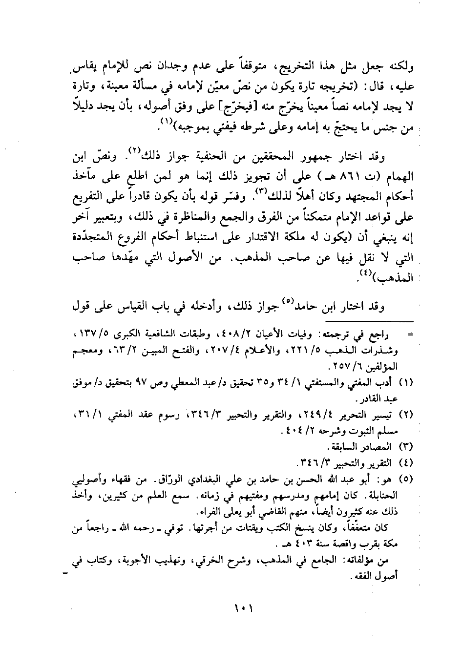 (¬5) هو: أبو عبد الله الحسن بن حامد بن علي البغدادي الوراق. من فقهاء وأصوليي الحنابلة. كان إمامهم ومدرسهم ومفتيهم في زمانه. سمع العلم من كثيرين، وأخذ ذلك عنه كثيرون أيضاً، منهم القاضي أبو يعلي الفراء. كان متعففاً، وكان ينسخ الكتب ويقتات من أجرتها، توفى – رحمه الله- راجعاً من مكة بقرب واقصة سنة 403هـ.