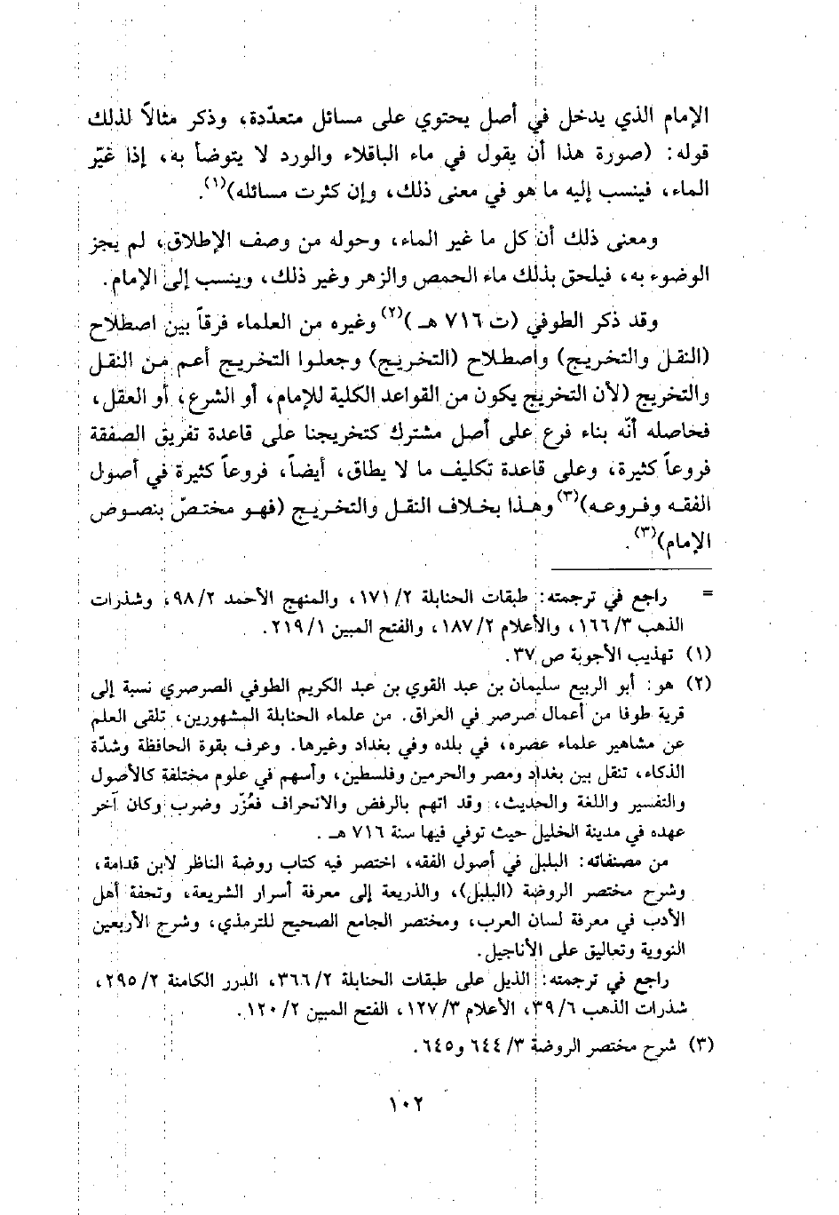 (¬2) هو: أبو الربيع سليمان بن عبد القوي بن عبد الكريم الطوفي الصرصري نسبة إلى قرية طوفا من أعمال صرصر في العراق. من علماء الحنابلة المشهورين، تلقى العلم عن مشاهير علماء عصره، في بلده وفي بغداد وغيرها، وعرف بقوة الحافظة وشدة الذكاء، تنقل بين بغداد ومصر والحرمين وفلسطين، وأسهم في علوم مختلفة كالأصول والتفسير واللغة والحديث، وقد اتهم بالرفض والانحراف فعزر وضرب وكان آخر عهده في مدينة الخليل حيث توفى فيها سنة 716هـ.
