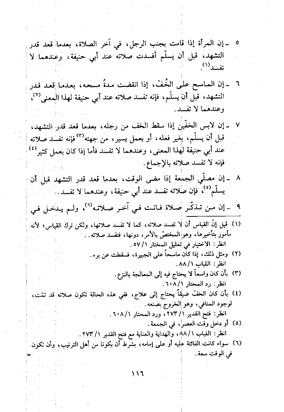 5 - إن المرأة إذا قامت بجنب الرجل، في آخر الصلاة، بعدما قعد قدر التشهد، قبل أن يسلم أفسدت صلاته عند أبي حنيفة، وعندهما لا تفسد (¬1).