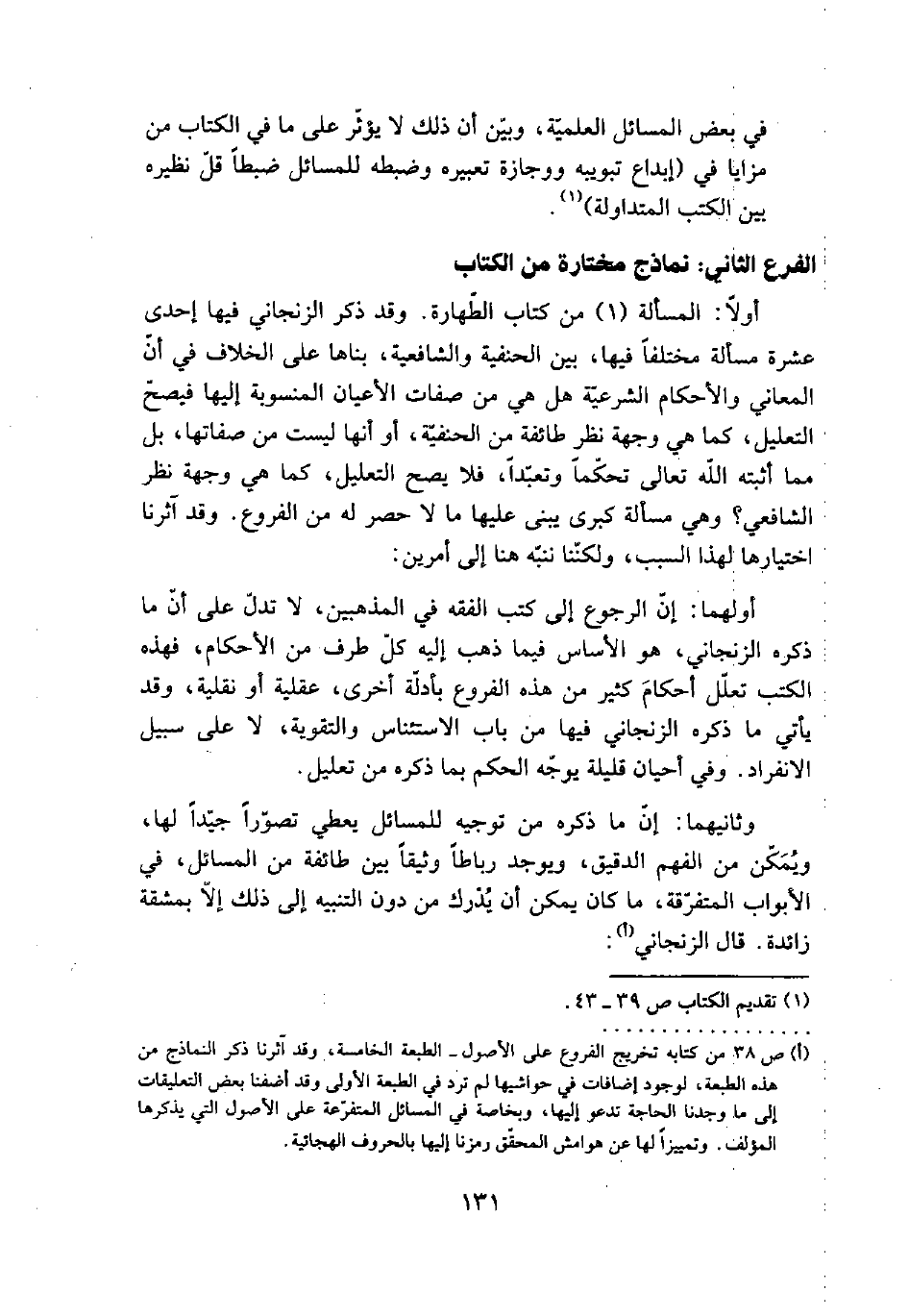 أولاً: المسألة (1) من كتاب الطهارة. وقد ذكر الزنجاني فيها إحدى عشرة مسألة مختلفاً فيها، بين الحنفية والشافعية، بناها على الخلاف في أن المعاني والأحكام الشرعية هل هي من صفات الأعيان المنسوبة إليها فيصح التعليل، كما هي وجهة نظر طائفة من الحنفية، أو أنها ليست من صفاتها، بل مما أثبته الله تعالى تحكماً وتعبداً، فلا يصح التعليل، كما هي وجهة نظر الشافعي؟ وهي مسألة كبرى يبنى عليها ما لا حصر له من الفروع. وقد آثرنا اختيارها لهذا السبب، ولكننا ننبه هنا إلى أمرين: