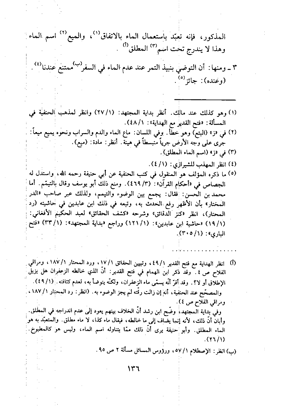 (¬5) ما ذكره المؤلف هو المنقول في كتب الحنفية عن أبي حنيفة رحمه الله، واستدل له الجصاص في "أحكام القرآن": (3/ 469). ومنع ذلك أبو يوسف وقال بالتيمم. أما محمد بن الحسن: فقال يجمع بين الوضوء والتيمم، ولذلك عبر صاحب "الدر المختار" بأن الأظهر رفع الحدث به، وتبعه في ذلك ابن عابدين في حاشيته (رد المحتار)، انظر "كنز الدقائق" وشرحه "كشف الحقائق" لعبد الحكيم الأفغاني: (1/ 19) "حاشية ابن عابدين": (1/ 121) وراجع "بداية المجتهد": (1/ 33) "فتح الباري": (1/ 305).
