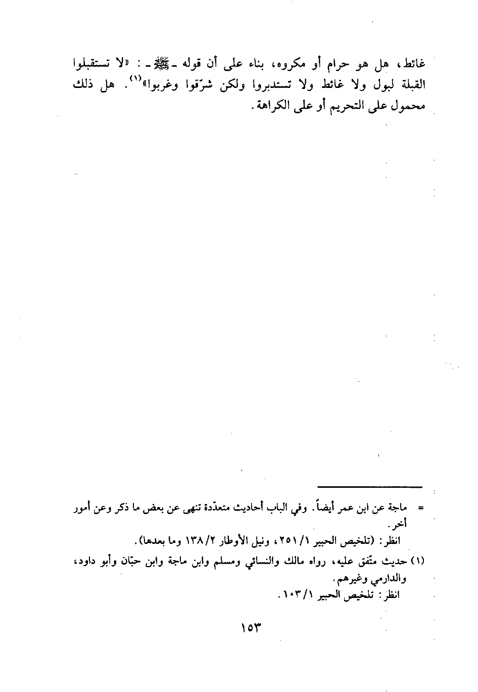غائط، هل هو حرام أو مكروه، بناء على أن قوله – صلى الله عليه وسلم -: "لا تستقبلوا القبلة لبول ولا غائط ولا تستدبروا ولكن شرقوا وغربوا" (¬1). هل ذلك محمول على التحريم أو على الكراهة.
