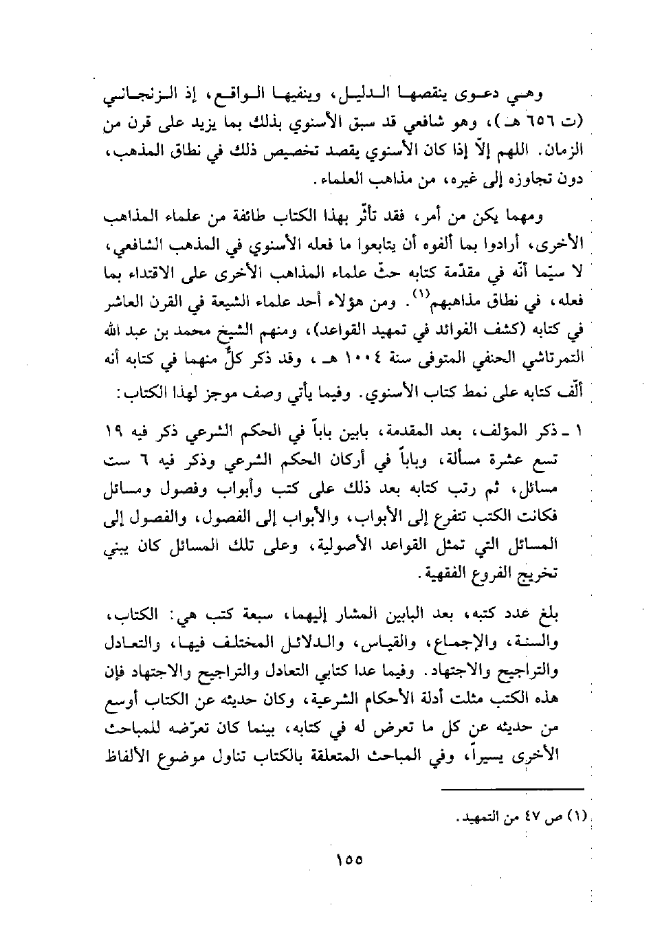 ومهما يكن من أمر، فقد تأثر بهذا الكتاب طائفة من علماء المذاهب الأخرى، أرادوا بما ألفوه أن يتابعوا ما فعله الأسنوي في المذهب الشافعي، لا سيما أنه في مقدمة كتابه حث علماء المذاهب الأخرى على الاقتداء بما فعله، في نطاق مذاهبهم (¬1). ومن هؤلاء احد علماء الشيعة في القرن العاشر في كتابه (كشف الفوائد في تمهيد القواعد)، ومنهم الشيخ محمد بن عبد الله التمرتاشي الحنفي المتوفى سنة 1004هـ، وقد ذكر كل منهما في كتابه أنه ألف كتابه على نمط كتاب الأسنوي. وفيما يأتي وصف موجز لهذا الكتاب: