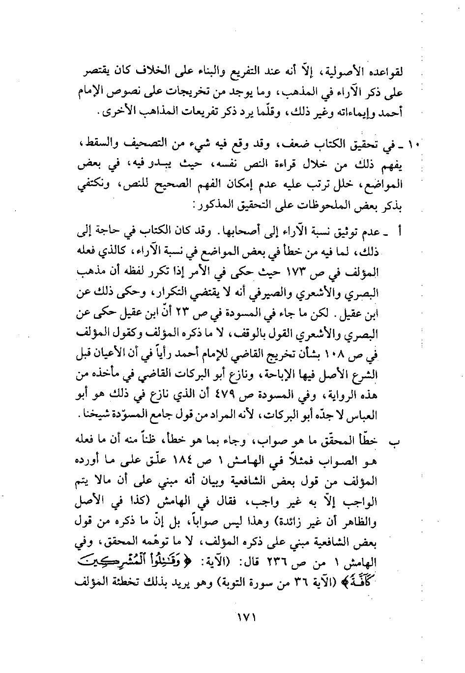ب- خطأ المحقق ما هو صواب، وجاء بما هو خطأ، ظناً منه أن ما فعله هو الصواب فمثلاً في الهامش 1 ص 184 علق على ما أورده المؤلف من قول بعض الشافعية وبيان أنه مبني على أن ما لا يتم الواجب إلا به غير واجب، فقال في الهامش (كذا في الأصل والظاهر أن غير زائدة) وهذا ليس صواباً، بل إن ما ذكره من قول بعض الشافعية مبني على ذكره المؤلف، لا ما توهمه المحقق، وفي الهامش 1 من ص 236 قال: (الآية: {وَقَاتِلُوا الْمُشْرِكِينَ كَافَّةً} (الآية 36 من سورة التوبة) وهو يريد بذلك تخطئة المؤلف