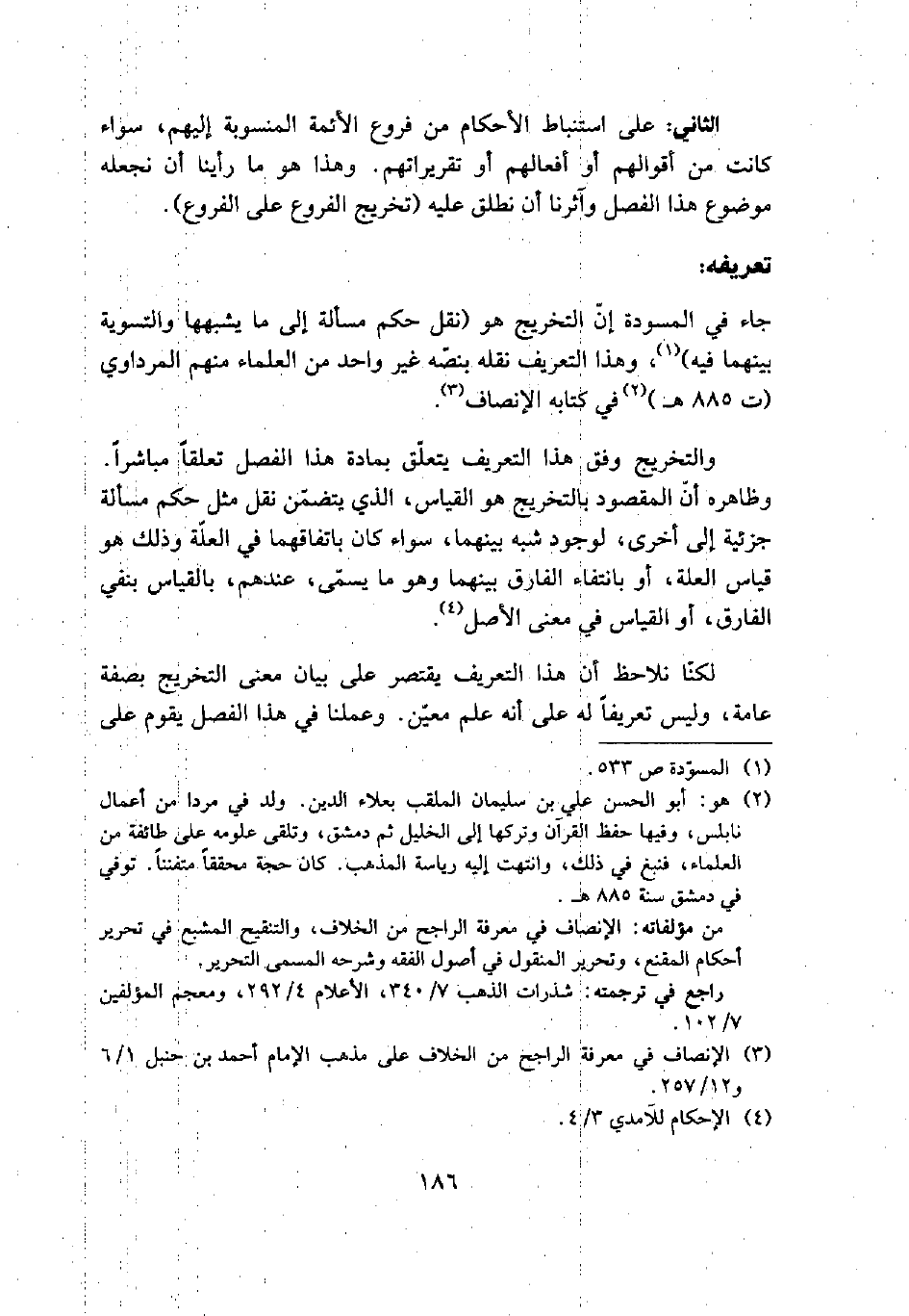 جاء في المسودة إن التخريج هو (نقل حكم مسألة إلى ما يشبهها والتسوية بينهما فيه) (¬1)، وهذا التعريف نقله بنصه غير واحد من العلماء منهم المرداوي (ت 885هـ) (¬2) في كتابه الإنصاف (¬3).