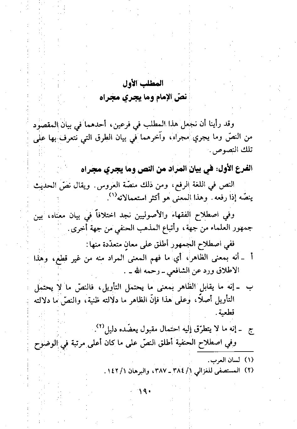وقد رأينا أن نجعل هذا المطلب في فرعين، أحدهما في بيان المقصود من النص وما يجري مجراه، وآخرهما في بيان الطرق التي نتعرف بها على تلك النصوص.