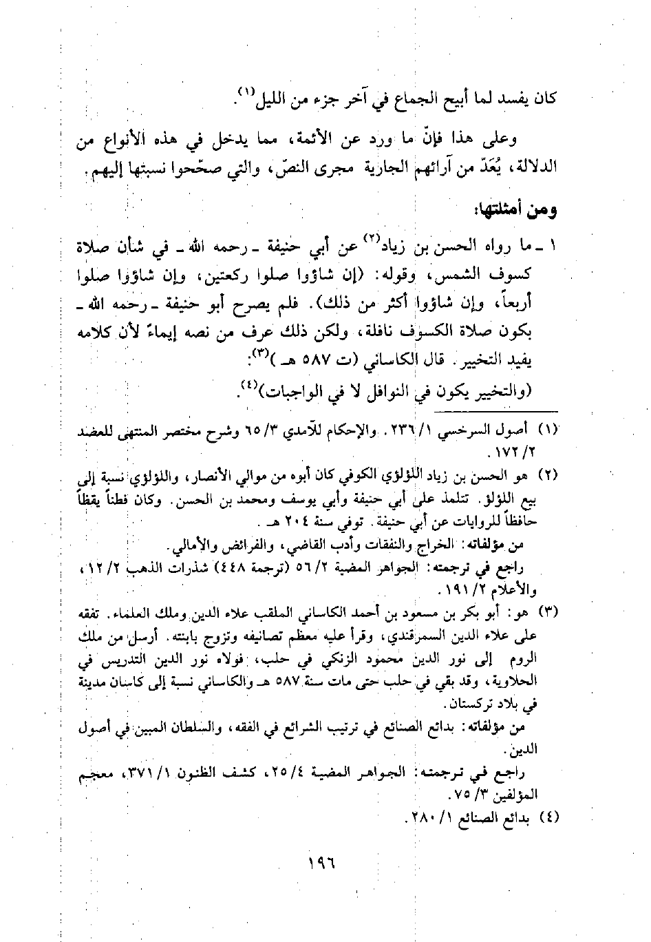 (¬2) هو الحسن بن زياد اللؤلؤي الكوفي كان أبوه من موالي الأنصار، واللؤلؤي نسبة إلى بيع اللؤلؤ. تتلمذ على أبي حنيفة وأبي يوسف ومحمد بن الحسن. وكان فطناً يقظاً حافظاً للروايات عن أبي حنيفة توفى سنة 204هـ.