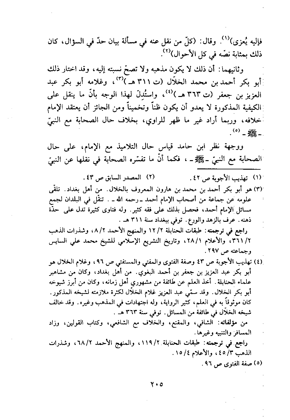 (¬4) تهذيب الأجوبة ص 43 وصفة الفتوى والمفتي والمستفتي ص 96، وغلام الخلال هو أبو بكر عبد العزيز بن جعفر بن أحمد البغوي. من أهل بغداد، وكان من مشاهير علماء الحنابلة. أخذ العلم عن طائفة من مشهوري أهل زمانه، وكان من أبرز شيوخه أبو بكر الخلال. وقد سمي عبد العزيز غلام الخلال لكثرة ملازمته لشيخه المذكور. كان موثوقاً به في العلم، كثير الرواية، وله اجتهادات في المذهب وغيره. وقد خالف شيخه الخلال في طائفة من المسائل. توفي سنة 363هـ.