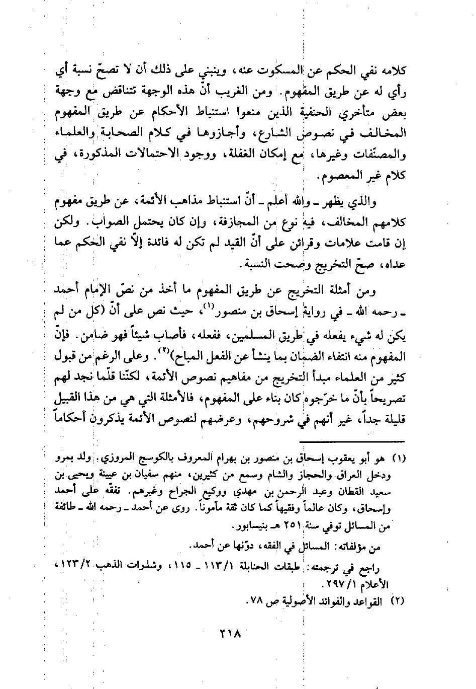 (¬1) هو أبو يعقوب إسحاق بن منصور بن بهرام المعروف بالكوسج المروزي. ولد بمرو ودخل العراق والحجاز والشام وسمع من كثيرين، منهم سفيان بن عيينة ويحيى بن سعيد القطان وعبد الرحمن بن مهدي ووكيع الجراح وغيرهم. تفقه على أحمد وإسحاق، وكان عالماً وفقيهاً كما كان ثقة مأموناً. روى عن أحمد- رحمه الله- طائفة من المسائل توفي سنة 251هـ بنيسابور.