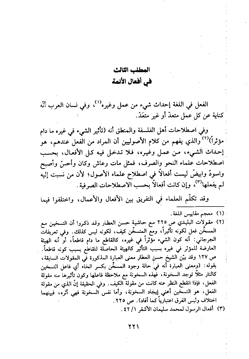 وفي اصطلاحات أهل الفلسفة والمنطق أنه [تأثير الشيء في غيره ما دام مؤثراً] (¬2) والذي يفهم من كلام الأصوليين أن المراد من الفعل عندهم، هو إحداث الشيء، من عمل وغيره، فلا تدخل فيه كل الأفعال، بحسب اصطلاحات علماء النحو والصرف، فمثل مات وعاش وكان وأحس وأصبح وأسود وأبيض ليست أفعالاً في اصطلاح علماء الأصول؛ لأن من نسبت إليه لم يفعلها (¬3)، وإن كانت أفعالاً بحسب الاصطلاحات الصرفية.
