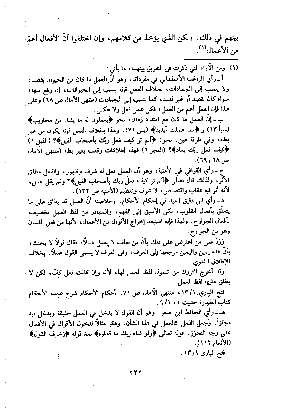 ج- رأي القرافي في الأمنية؛ وهو أن العمل فعل له شرف وظهور، والفعل مطلق الأثر، ولذلك قال تعالى {ألم تر كيف فعل ربك بأصحاب الفيل؟} ولم يقل عمل، لأنه أثر فيه عقاب واقتصاص، لا شرف وتعظيم [الأمنية ص 132].