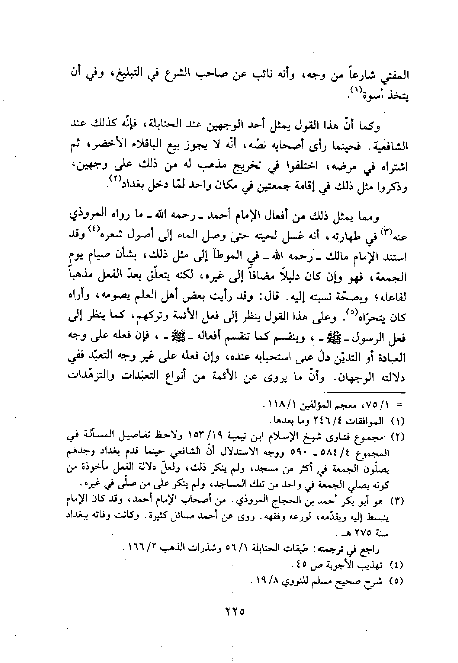 ومما يمثل ذلك من أفعال الإمام أحمد- رحمه الله- ما رواه المروذي عنه (¬3) في طهارته، أنه غسل لحيته حتى وصل الماء إلى أصول شعره (¬4) وقد استند الإمام مالك- رحمه الله- في الموطأ إلى مثل ذلك، بشأن صيام يوم الجمعة، فهو وإن كان دليلاً مضافاً إلى غيره، لكنه يتعلق بعد الفعل مذهباً لفاعله؛ وبصحة نسبته إليه. قال: وقد رأيت بعض أهل العلم يصومه، وأراه كان يتحراه (¬5). وعلى هذا القول ينظر إلى فعل الأئمة وتركهم، كما ينظر إلى فعل الرسول- صلى الله عليه وسلم- وينقسم كما تنقسم أفعاله- صلى الله عليه وسلم-، فإن فعله على وجه العبادة أو التدين دل على استحبابه عنده، وإن فعله على غير وجه التعبد ففي دلالته الوجهان. وأن ما يروي عن الأئمة من أنواع التعبدات والتزهدات