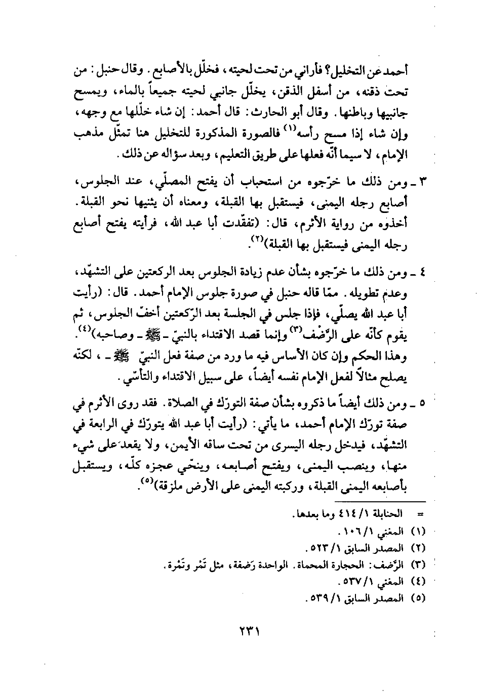 4 - ومن ذلك ما خرجوه بشأن عدم زيادة الجلوس بعد الركعتين على التشهد، وعدم تطويله. مما قاله حنبل في صورة جلوس الإمام أحمد. قال: [رأيت أبا عبد الله يصلي، فإذا جلس في الجلسة بعد الركعتين أخف الجلوس، ثم يقوم كأنه على الرضف (¬3) وإنما قصد الاقتداء بالنبي- صلى الله عليه وسلم- وصاحبه] (¬4). وهذا الحكم وإن كان الأساس فيه ما ورد من صفة فعل النبي صلى الله عليه وسلم- لكنه يصلح مثالاً لفعل الإمام نفسه أيضاً، على سبيل الاقتداء والتأسي.
