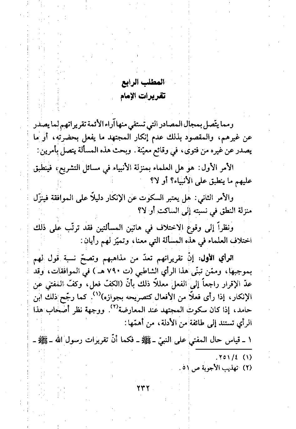 الرأي الأول: إن تقريراتهم تعد من مذاهبهم وتصح نسبة قول لهم بموجبها، وممن تبنى هذا الرأي الشاطبي (ت 790هـ) في الموافقات، وقد عد الإقرار راجعاً إلى الفعل معللاً ذلك بأن (الكف فعل، وكف المفتي عن الإنكار، إذا رأى فعلاً من الأفعال كتصريحه بجوازه) (¬1). كما رجح ذلك ابن حامد، إذا كان سكوت المجتهد عند المعارضة (¬2). ووجهة نظر أصحاب هذا الرأي تستند إلى طائفة من الأدلة، من أهمها: