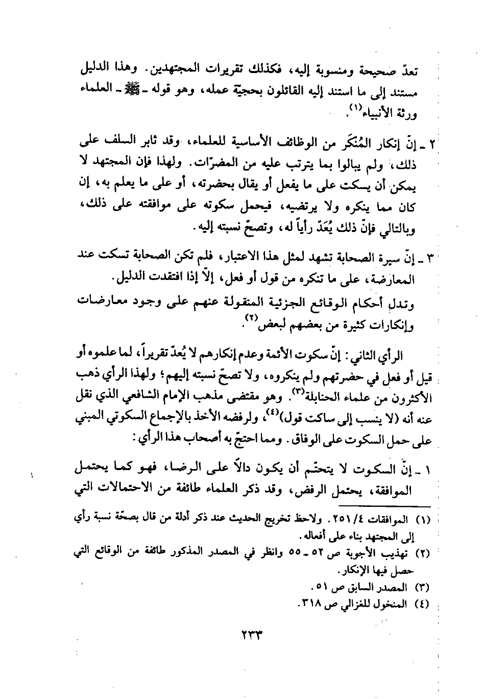 2 - إن إنكمار المنكر من الوظائف الأساسية للعلماء، وقد ثابر السلف على ذلك، ولم يبالوا بما يترتب عليه من المضرات. ولهذا فإن المجتهد لا يمكن أن يسكت على ما يفعل أو يقال بحضرته، أو على ما يعلم به، إن كان مما ينكره ولا يرتضيه، فيحمل سكوته على موافقته على ذلك، وبالتالي فإن ذلك يعد رأياً له، وتصح نسبته إليه.