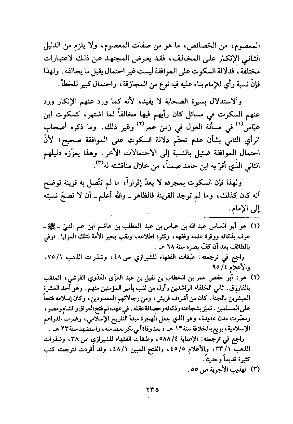 والاستدلال بسيرة الصحابة لا يفيد؛ لأنه كما ورد عنهم الإنكار ورد عنهم السكوت في مسائل كان رأيهم فيها مخالفاً لما اشتهر، كسكوت ابن عباس (¬1) في مسألة العول في زمن عمر (¬2) وغير ذلك. وما ذكره أصحاب الرأي الثاني بشأن عدم تحتم دلالة السكوت على الموافقة صحيح؛ لأن احتمال الموافقة ضئيل بالنسبة إلى الاحتمالات الآخر. وهذا يعززه دليلهم الثاني الذي أقر به ابن حامد ضمناً، من خلال مناقشته له (¬3).