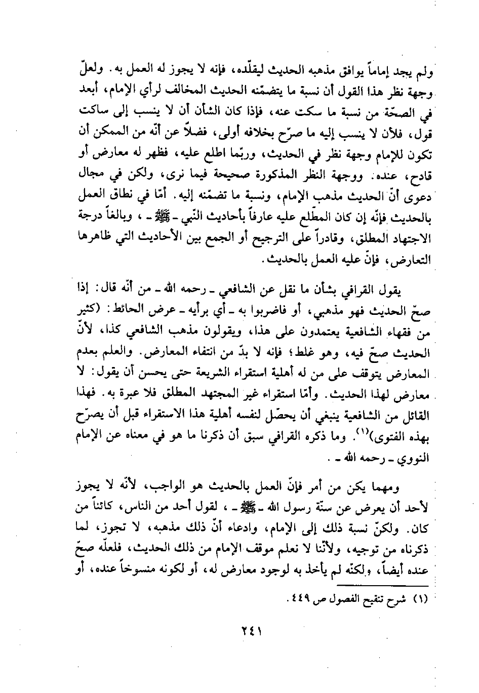 يقول القرافي بشأن ما نقل عن الشافعي – رحمه الله- من أنه قال: إذا صح الحديث فهو مذهبي، أو فاضربوا به- أي برأيه- عرض الحائط: (كثير من فقهاء الشافعية يعتمدون على هذا، ويقولون مذهب الشافعي كذا، لأن الحديث صح فيه، وهو غلط؛ فإنه لا بد من انتفاء المعارض. والعلم بعدم المعارض يتوقف على من له أهلية استقراء الشريعة حتى يحسن أن يقول: لا معارض لهذا الحديث. وأما استقراء غير المجتهد المطلق فلا عبرة به. فهذا القائل من الشافعية ينبغي أن يحصل لنفسه أهلية هذا الاستقراء قبل أن يصرح بهذه الفتوى) (¬1). وما ذكره القرافي سبق أن ذكرنا ما هو في معناه عن الإمام النووي- رحمه الله-.