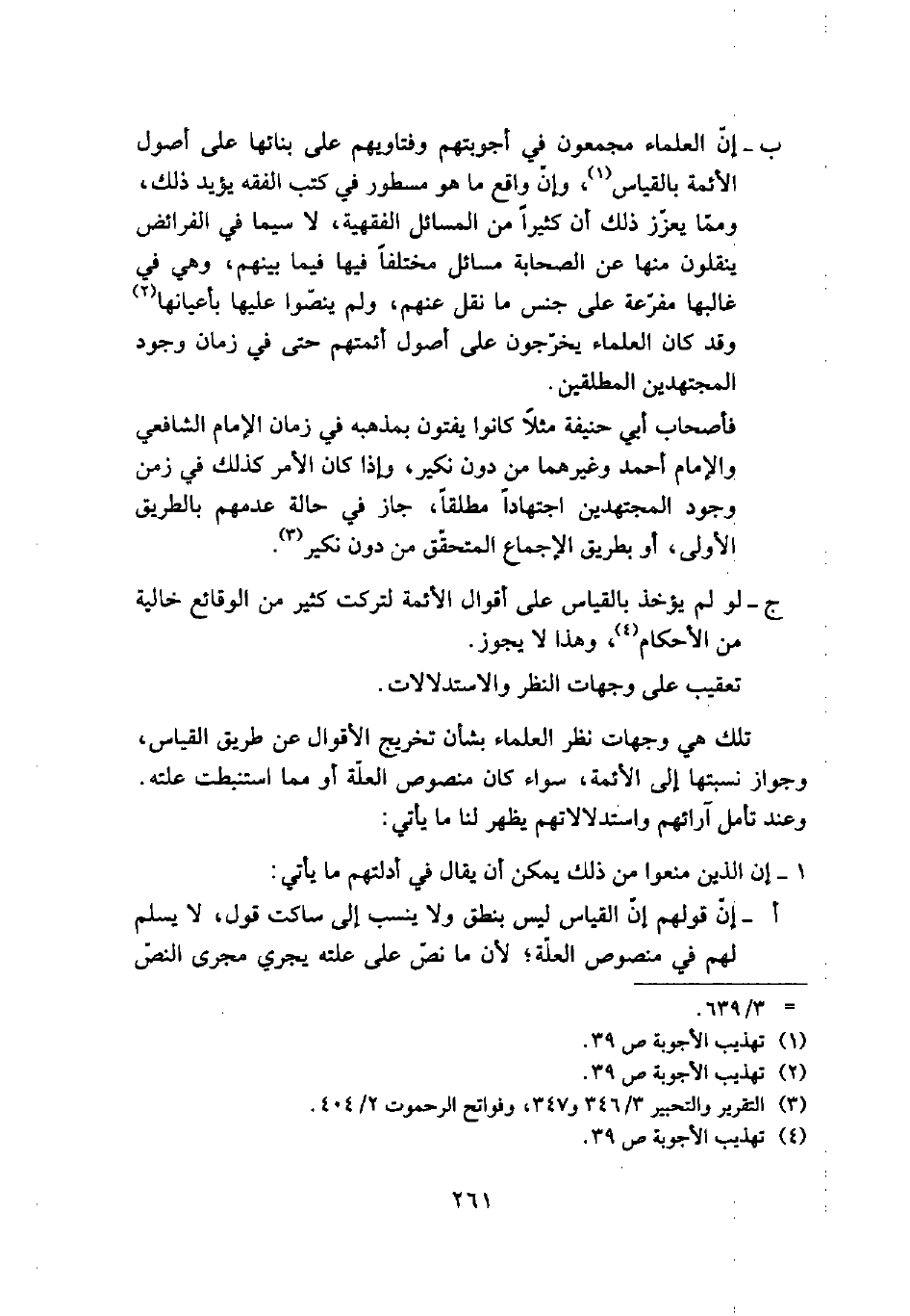ب- إن العلماء مجمعون في أجوبتهم وفتاويهم على بنائها على أصول الأئمة بالقياس (¬1)، وإن واقع ما هو مسطور في كتب الفقه يؤيد ذلك، ومما يعزز ذلك أن كثيراً من المسائل الفقهية، لا سيما في الفرائض ينقلون منها عن الصحابة مسائل مختلفاً فيها فيما بينهم، وهي في غالبها مفرعة على جنس ما نقل عنهم، ولم ينصوا عليها بأعيانها (¬2) وقد كان العلماء يخرجون على أصول أئمتهم حتى في زمان وجود المجتهدين المطلقين.