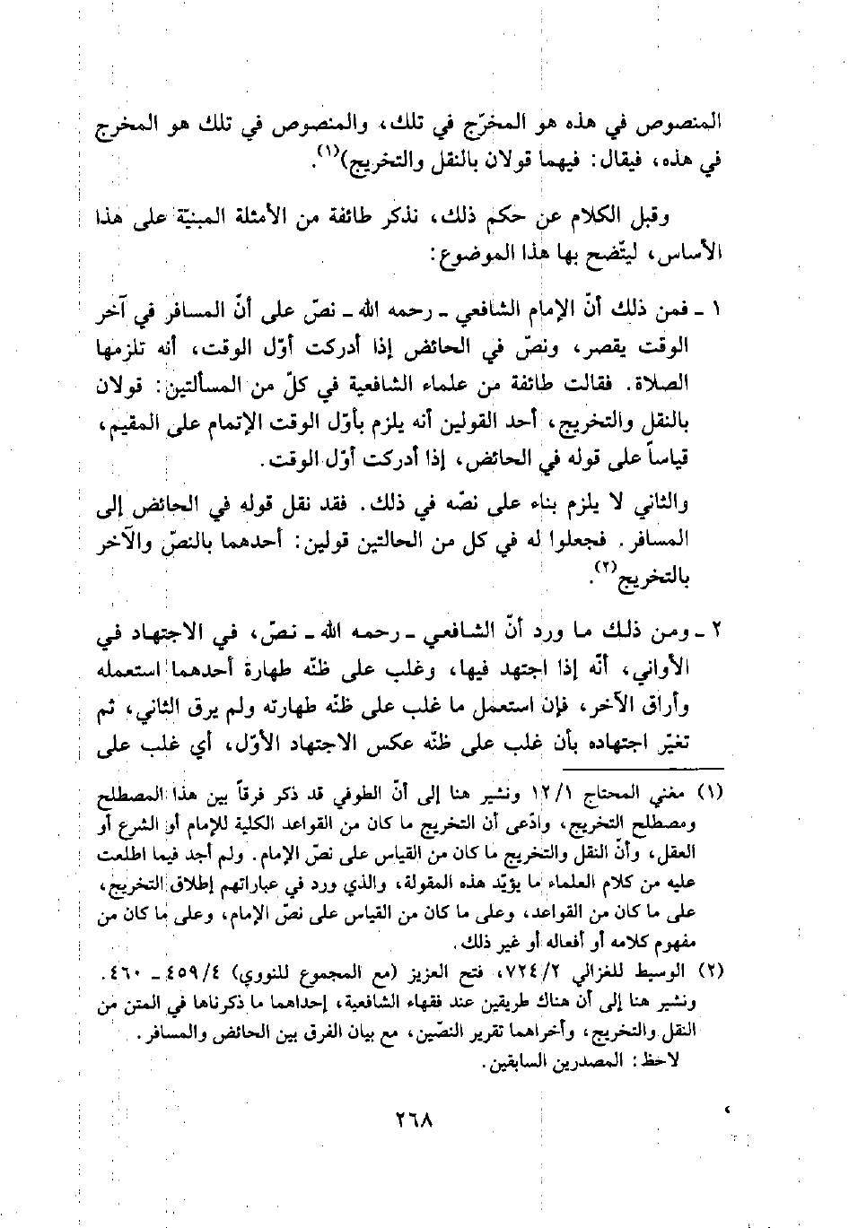 1 - فمن ذلك أن الإمام الشافعي- رحمه الله- نص على أن المسافر في آخر الوقت يقصر، ونص في الحائض إذا أدركت أول الوقت، أنه تلزمها الصلاة. فقالت طائفة من علماء الشافعية في كل من المسألتين: قولان بالنقل والتخريج، أحد القولين أنه يلزم بأول الوقت الإتمام على المقيم، قياساً على قوله في الحائض، إذا أدركت أول الوقت.
