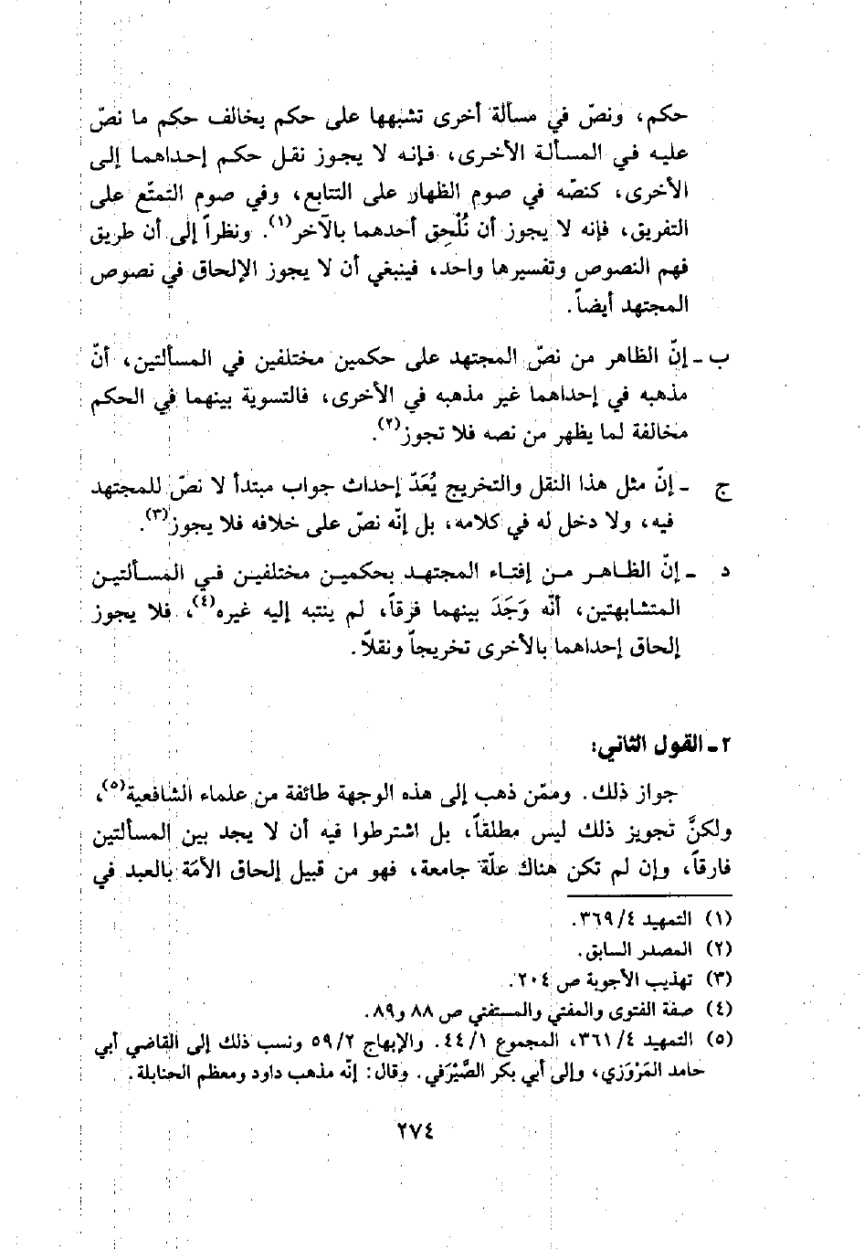 ب- إن الظاهر من نص المجتهد على حكمين مختلفين في المسألتين، أن مذهبه في إحداهما غير مذهبه في الأخرى، فالتسوية بينهما في الحكم مخالفة لما يظهر من نصه فلا تجوز (¬2).