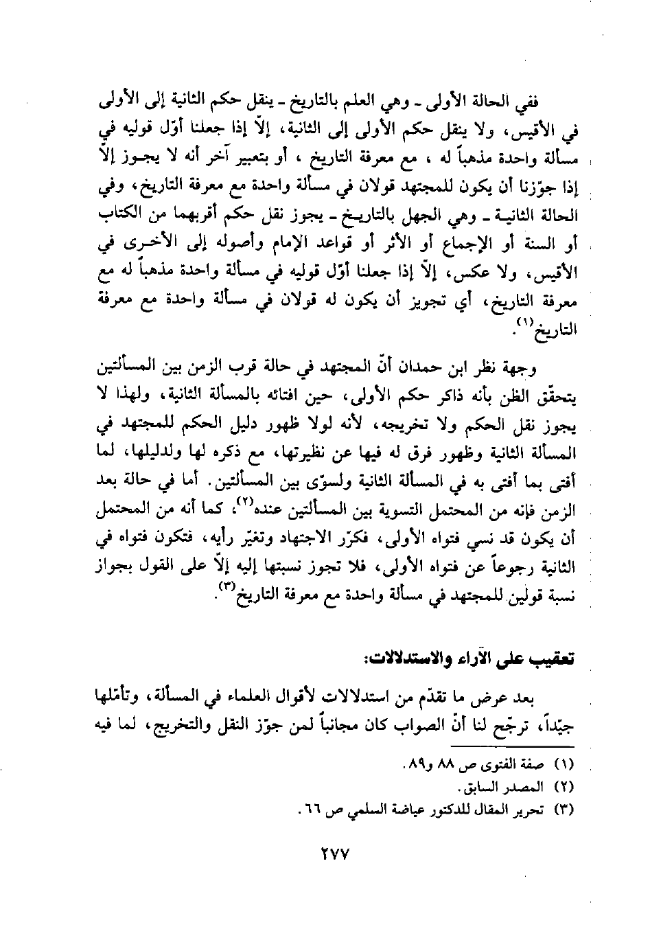 وجهة نظر ابن حمدان أن المجتهد في حالة قرب الزمن بين المسألتين يتحقق الظن بأنه ذاكر حكم الأولى، حين افتائه بالمسألة الثانية، ولهذا لا يجوز نقل الحكم ولا تخريجه، لأنه لولا ظهور دليل الحكم للمجتهد في المسألة الثانية وظهور فرق له فيها عن نظيرتها، مع ذكره لها ولدليلها، لما أفتى بما أفتى به في المسألة الثانية ولسوى بين المسألتين. أما في حالة بعد الزمن فإنه من المحتمل التسوية بين المسألتين عنده (¬2)، كما أنه من المحتمل أن يكون قد نسي فتواه الأولى، فكرر الاجتهاد وتغير رأيه، فتكون فتواه في الثانية رجوعاً عن فتواه الأولى، فلا تجوز نسبتها إليه إلا على القول بجواز نسبة قولين للمجتهد في مسألة واحدة مع معرفة التاريخ (¬3).