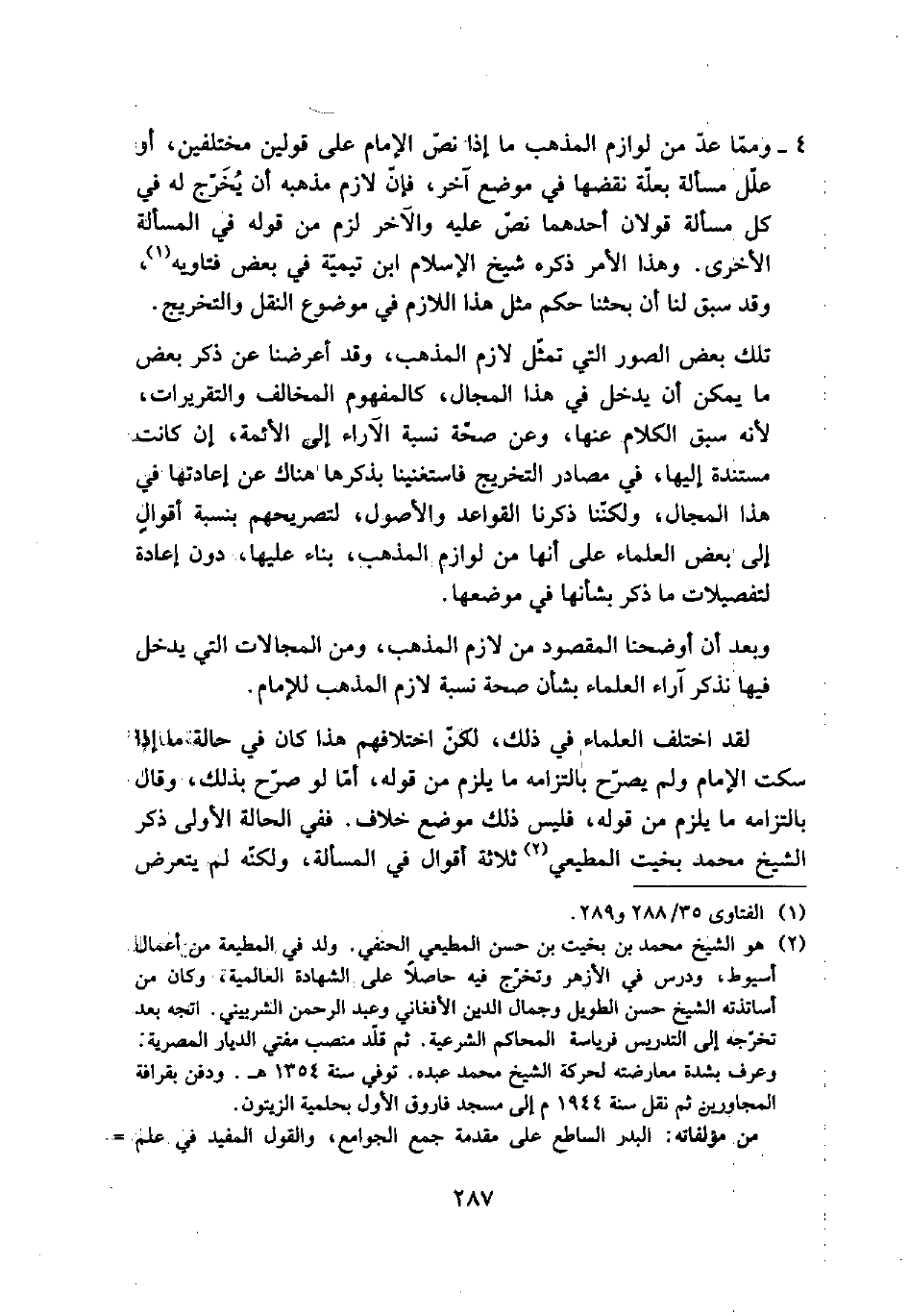 لقد اختلف العلماء في ذلك، لكن اختلافهم هذا كان في حالة ما إذا سكت الإمام ولم يصرح بالتزامه ما يلزم من قوله، أما لو صرح بذلك، وقال بالتزامه ما يلزم من قوله، فليس ذلك موضع خلاف. ففي الحالة الأولى ذكر الشيخ محمد بخيت المطيعي (¬2) ثلاثة أقوال في المسألة، ولكنه لم يتعرض
