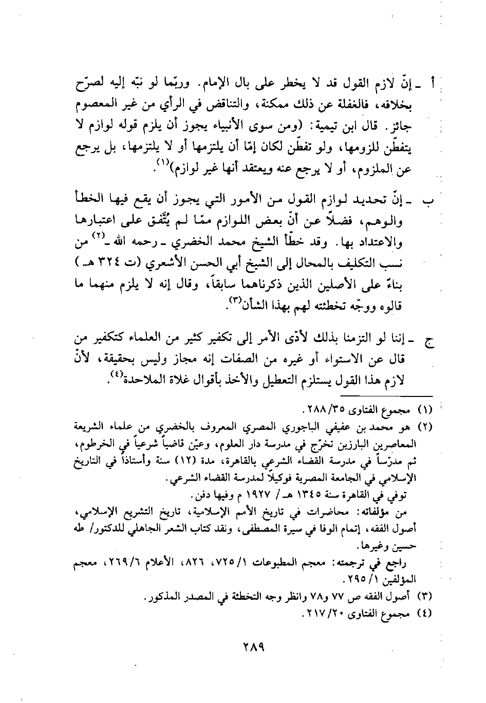 ب- إن تحديد لوازم القول من الأمور التي يجوز أن يقع فيها الخطأ والوهم، فضلاً عن أن بعض اللوازم مما لم يتفق على اعتبارها والاعتداد بها. وقد خطأ الشيخ محمد الخضيري- رحمه الله- (¬2) من نسب التكليف بالمحال إلى الشيخ أبي الحسن الأشعري (ت 324هـ) بناءً على الأصلين الذين ذكرناهما سابقاً، وقال إنه لا يلزم منهما ما قالوه ووجه تخطئته لهم بهذا الشأن (¬3).