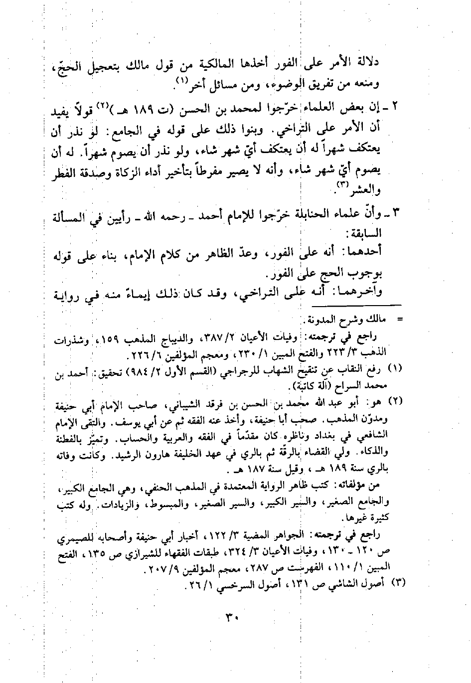 2 - إن بعض العلماء خرجوا لمحمد بن الحسن (ت 189هـ) (¬2) قولاً يفيد أن الأمر على التراخي. وبنوا ذلك على قوله في الجامع: لو نذر أن يعتكف شهراً له أن يعتكف أي شهر شاء، ولو نذر أن يصوم شهراً. له أني صوم أي شهر شاء، وأنه لا يصير مفرطاً بتأخير أداء الزكاة وصدقة الفطر والعشر (¬3).