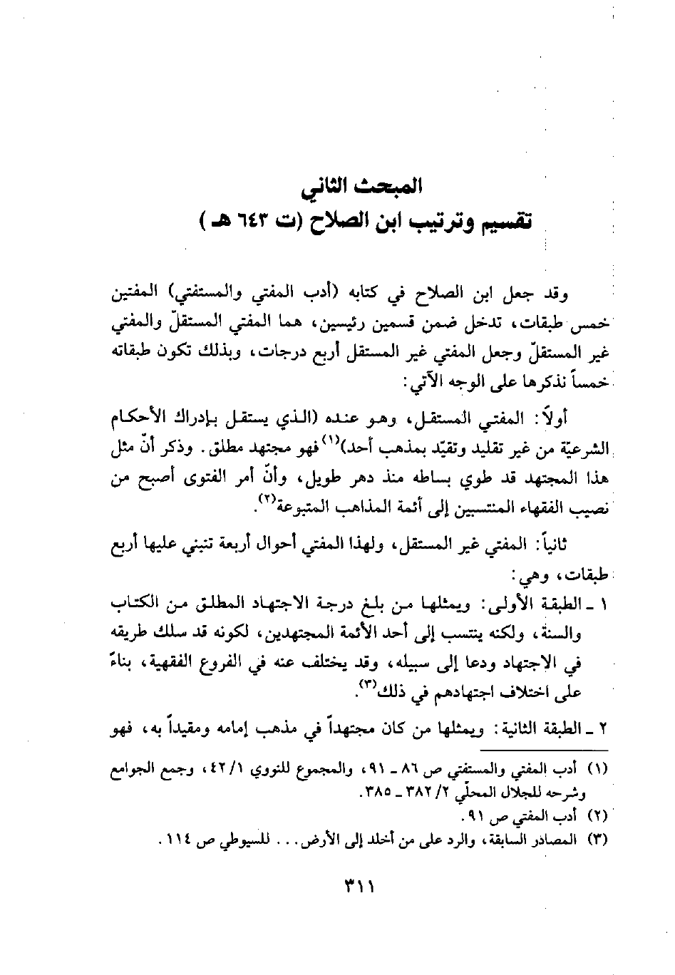 وقد جعل ابن الصلاح في كتابه (أدب المفتي والمستفتي) المفتين خمس طبقات، وتدخل ضمن قسمين رئيسين، هما المفتي المستقل والمفتي غير المستقل وجعل المفتي غير المستقل أربع درجات، وبذلك تكون طبقاته خمساً نذكرها على الوجه الآتي: