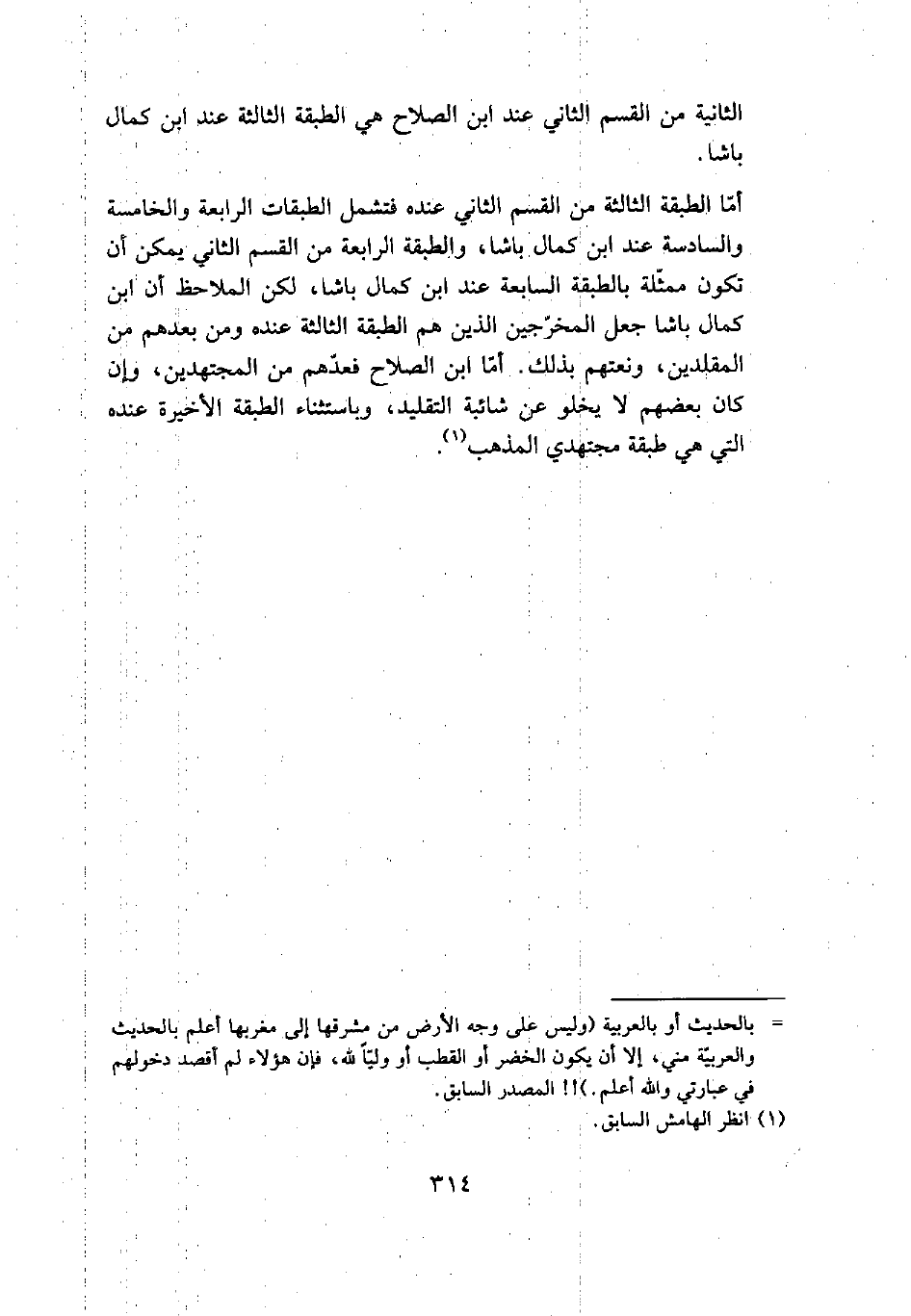 أما الطبقة الثالثة من القسم الثاني عنده فتشمل الطبقات الرابعة والخامسة والسادسة عند ابن كمال باشا، والطبقة الرابعة من القسم الثاني يمكن أن تكون ممثلة بالطبقة السابعة عند ابن كمال باشا، لكن الملاحظ أن ابن كمال باشا جعل المخرجين الذين هم الطبقة الثالثة عنده ومن بعدهم من المقلدين، ونعتهم بذلك. أما ابن الصلاح فعدهم من المجتهدين، وإن كان بعضهم لا يخلو عن شائبة التقليد، وباستثناء الطبقة الأخيرة عنده التي هي طبقة مجتهدي المذهب (¬1).