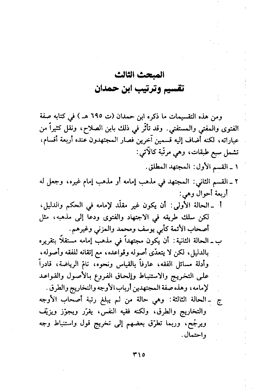 ومن هذه التقسيمات ما ذكره ابن حمدان (ت 695هـ) في كتابه صفة الفتوى والمفتي والمستفتي. وقد تأثر في ذلك بابن الصلاح، ونقل كثيراً من عباراته، لكنه أضاف إليه قسمين آخرين فصار المجتهدون عنده أربعة أقسام، تشمل سبع طبقات، وهي مرتبة كالآتي:
