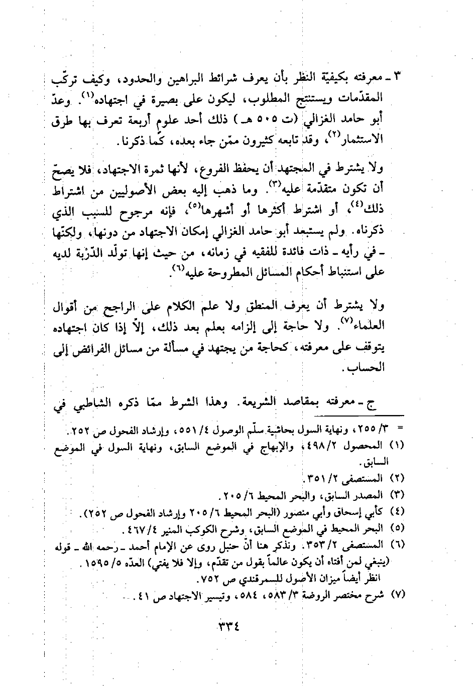 3 - معرفته بكيفية النظر بأن يعرف شرائط البراهين والحدود، وكيف تركب المقدمات ويستنتج المطلوب، ليكون على بصيرة في اجتهاده (¬1). وعد أبو حامد الغزالي (ت 505هـ) ذلك أحد علوم أربعة تعرف بها طرق الاستثمار (¬2)، وقد تابعه كثيرون ممن جاء بعده، كما ذكرنا.