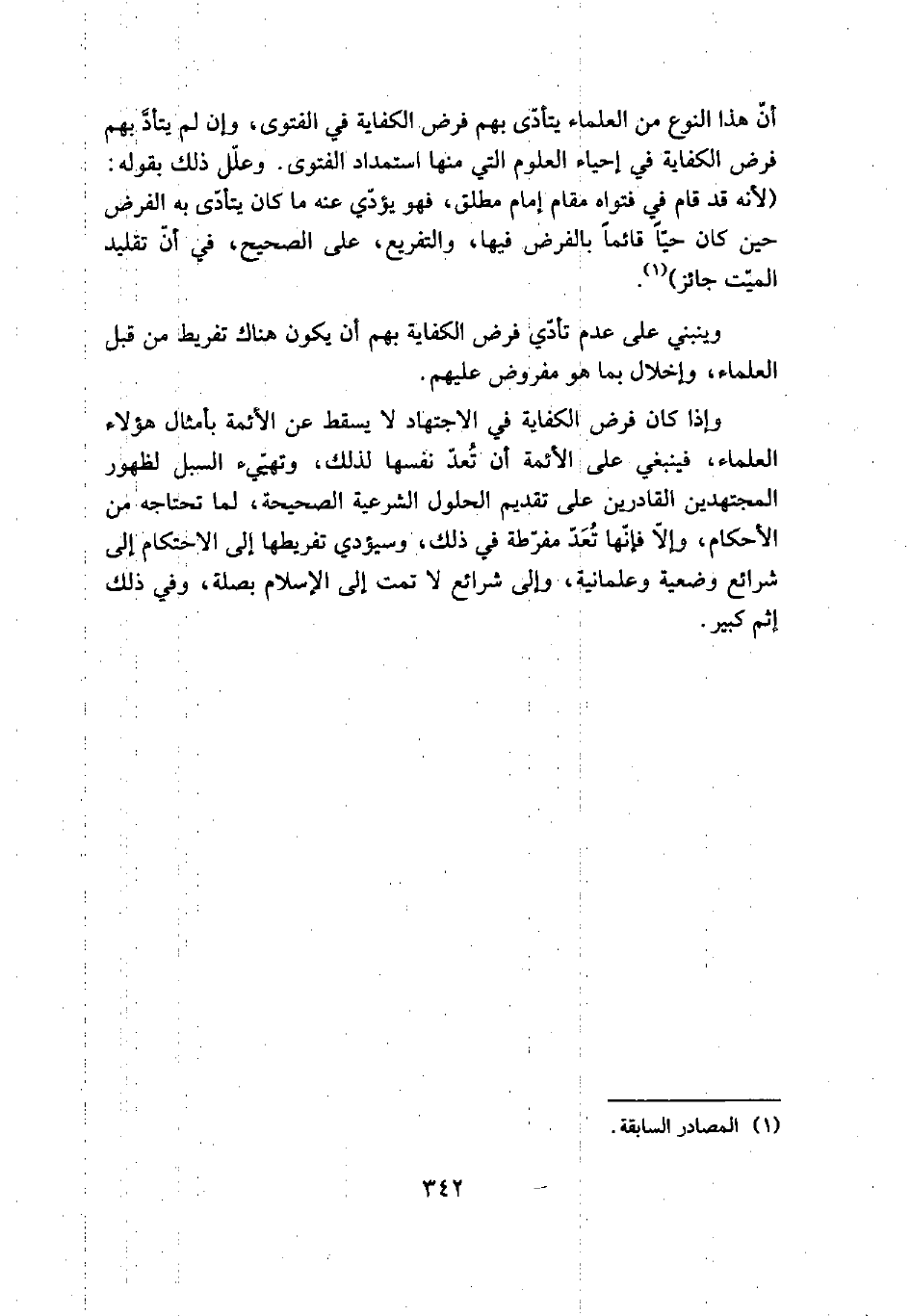 أن هذا النوع من العلماء يتأدى بهم فرض الكفاية في الفتوى، وإن لم يتأد بهم فرض الكفاية في إحياء العلوم التي منها استمداد الفتوى. وعلل ذلك بقوله: (لأنه قد قام في فتواه مقام إمام مطلق، فهو يؤدي عنه ما كان يتأدى به الفرض حين كان حياً قائماً بالفرض فيها، والتفريع، على الصحيح، في أن تقليد الميت جائز) (¬1).